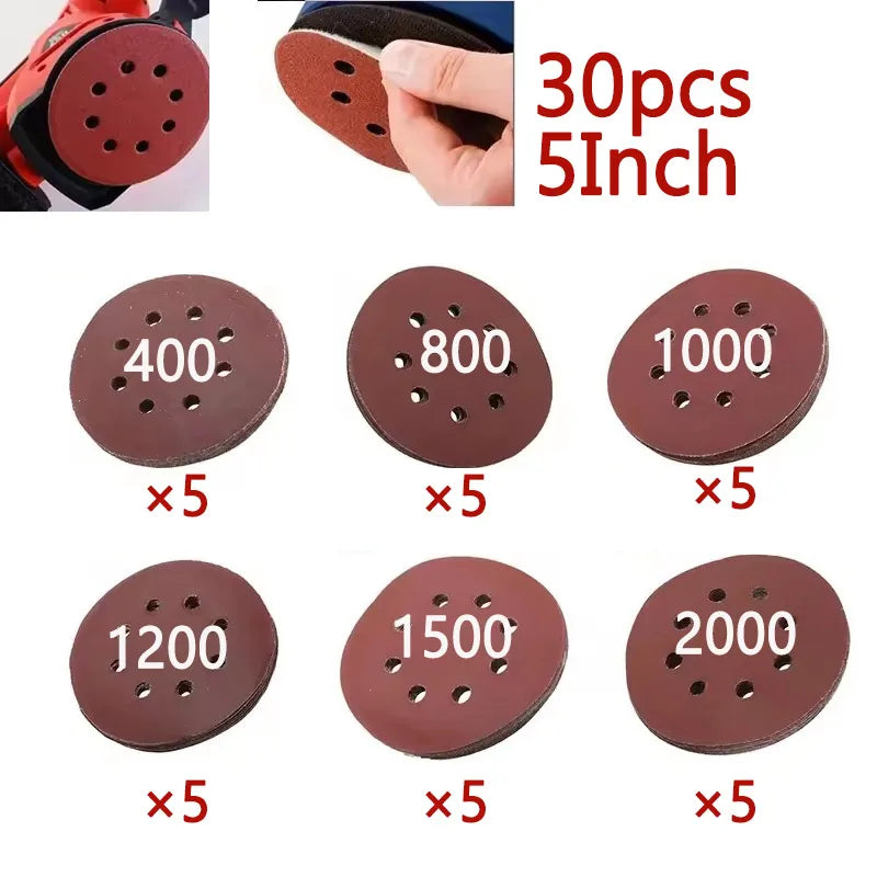 30PCS 5" 8-Hole Hook & Loop Sanding Discs 125mm for Random Orbital Sander 400-2000 Grits Abrasive Sheets
