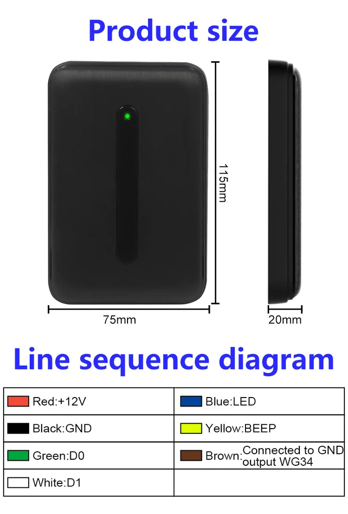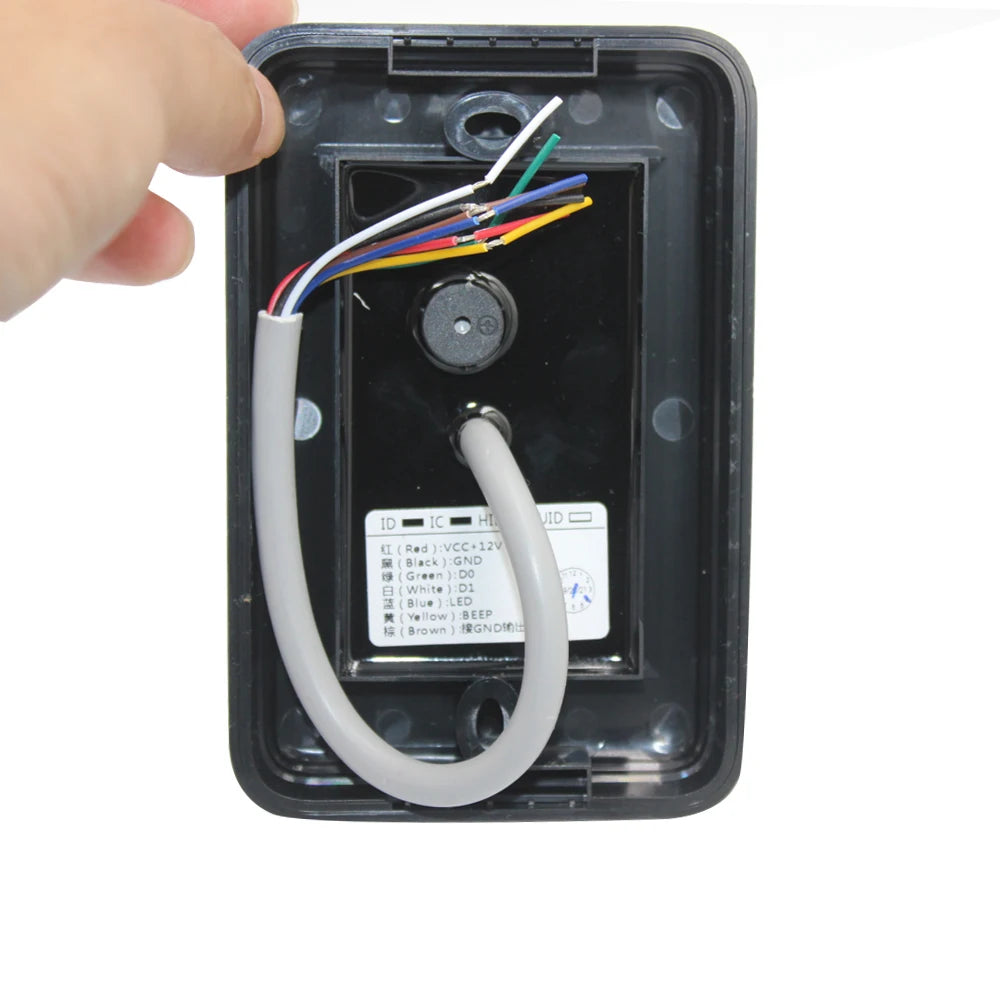 Housed in a durable plastic casing, this RFID reader is designed to consume minimal energy, with a static current of less than 30mA. It features a Wiegand output format of WG26/34, suitable for seamless integration with existing access control systems. Please note that this unit is a slave reader and requires a separate controller that supports the Wiegand protocol for full functionality. It does not include a relay or standalone capabilities.