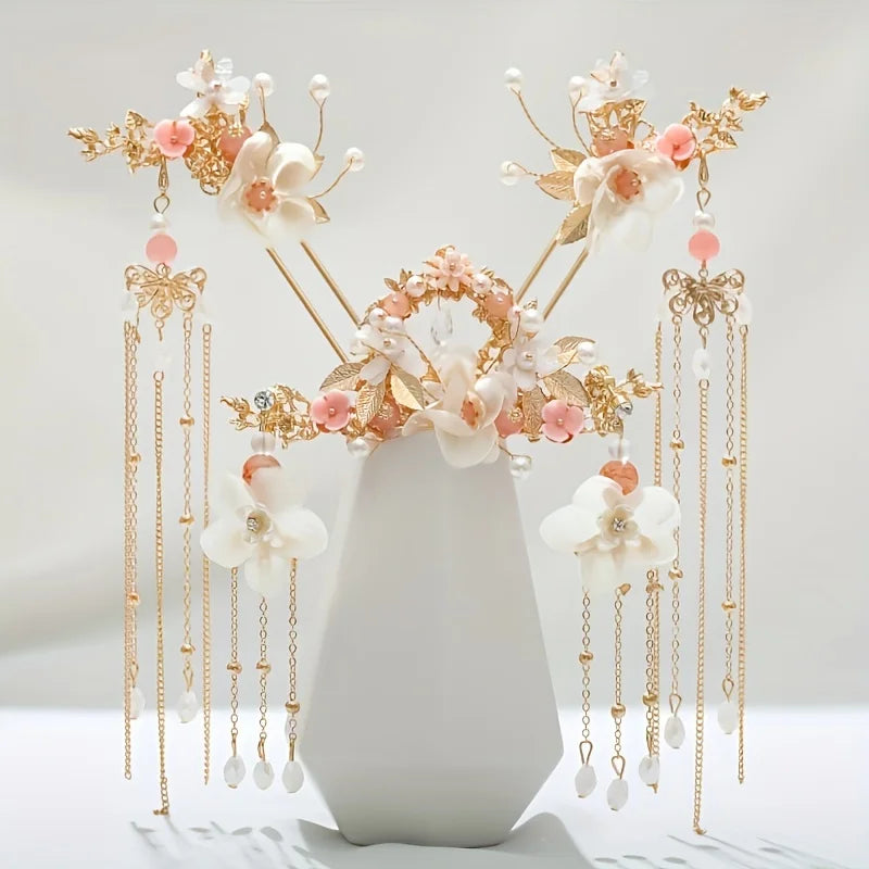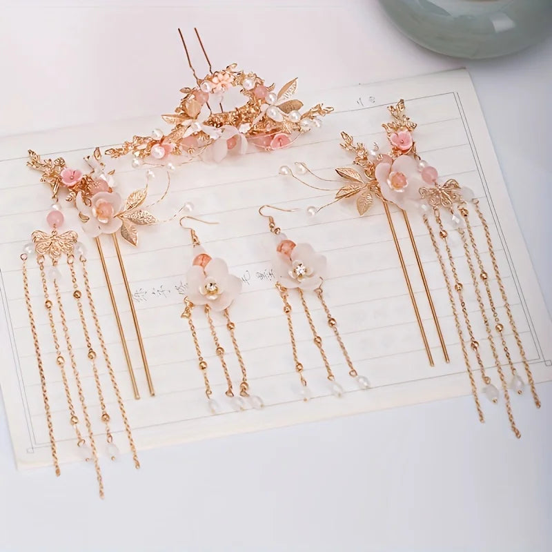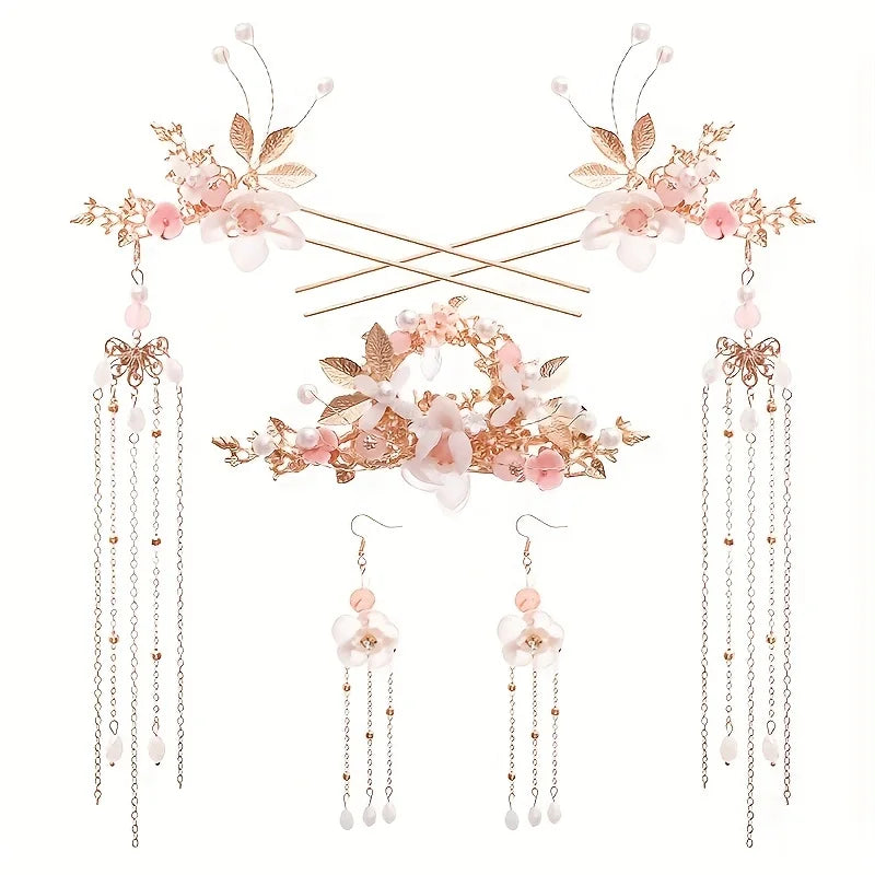 Chinese Pearl Hairpin Earring Tiara Set for Women - Floral Crystal Hanfu Hair Accessories Comb