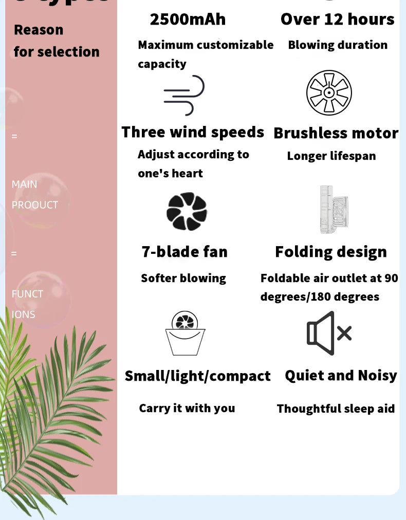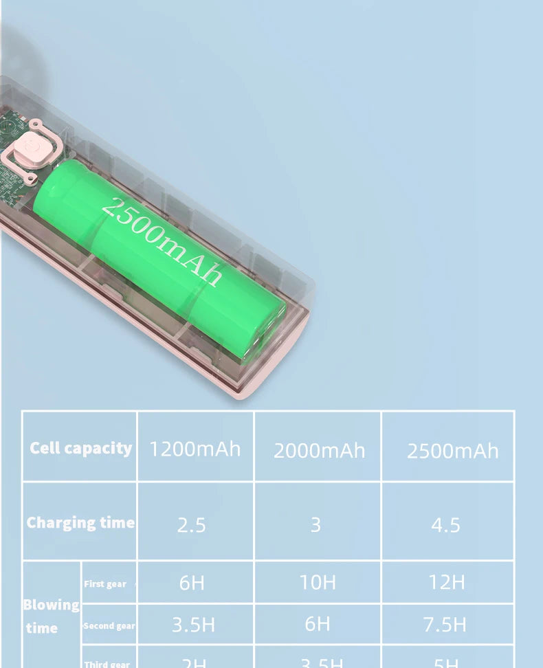 Enhance your personal space with this compact and portable fan, designed to deliver a refreshing breeze in areas of less than 10 square meters. Ideal for desktops, bedrooms, or any small space, the fan offers versatile air supply through its rotary vane system featuring seven blades. With a focus on convenience, this fan is powered by a rechargeable battery, allowing for easy placement without the worry of finding a nearby power source.