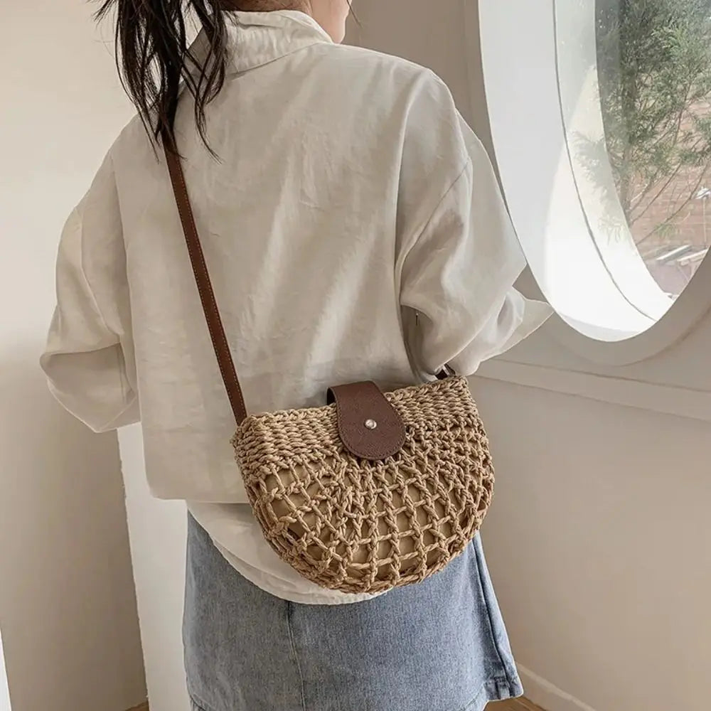 Handmade Summer Straw Crossbody Bag - Rattan Semi-Circle Beach Tote Handbag