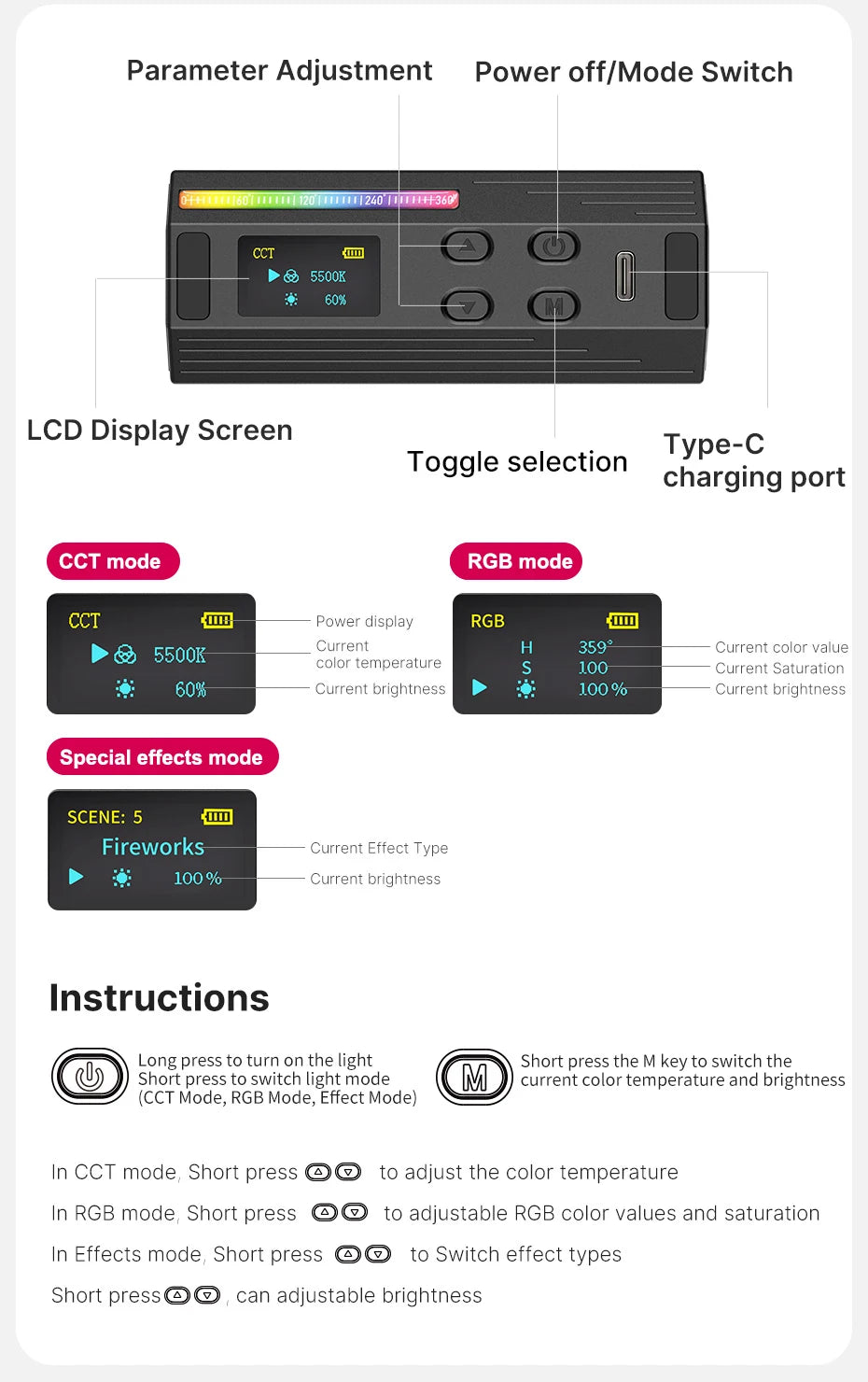 Weighing only 109g and measuring 10cm in length, this lightweight device fits effortlessly into any gear bag. The RGB light offers HSI Mode with 360° adjustability, allowing for creative freedom with hue adjustments from 0° to 360°, brightness from 0% to 100%, and color temperature ranging from a warm 2500K to a cool 9000K.