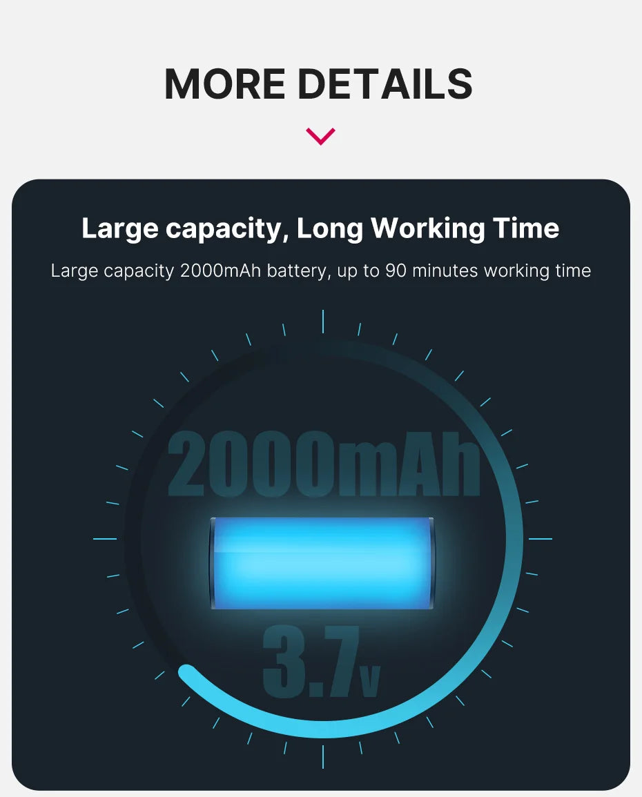 - Battery and Charging: 2000mAh battery, 90-minute endurance at max power, 2.5-hour charge time