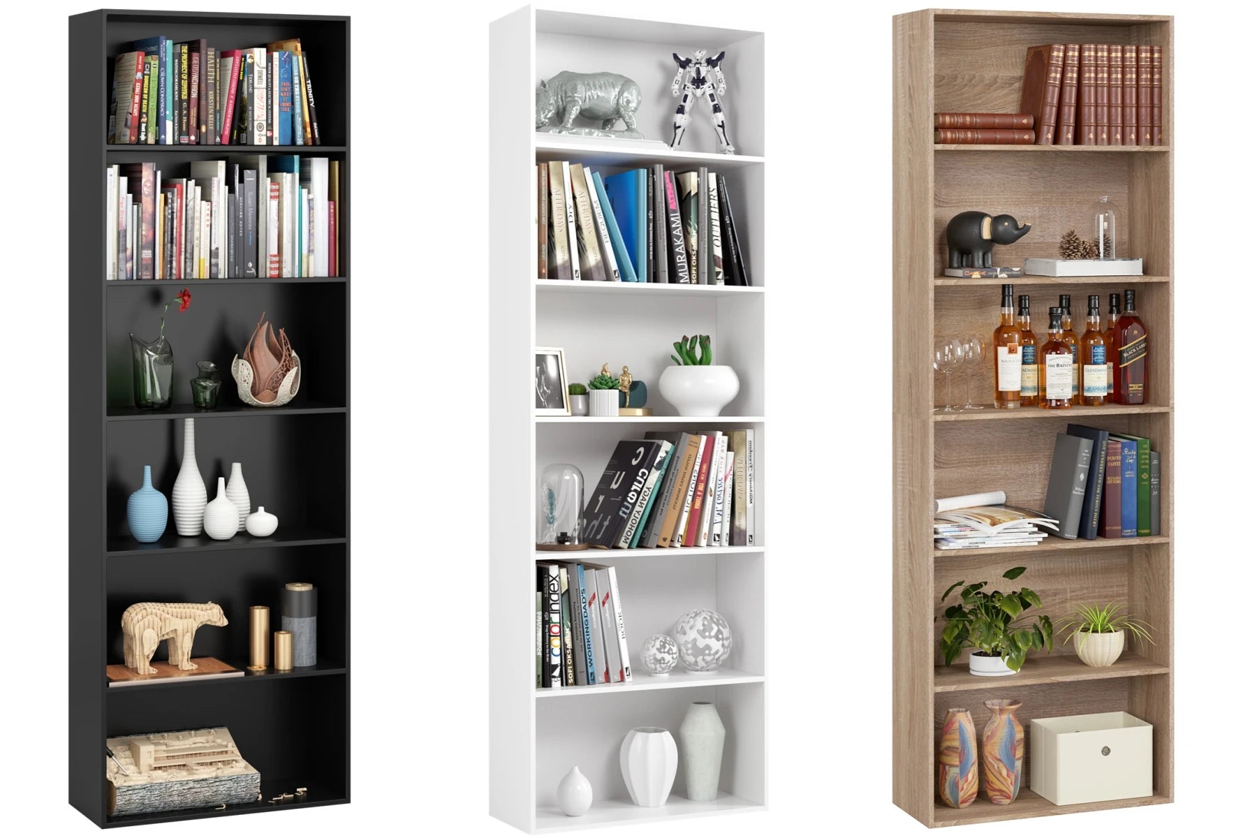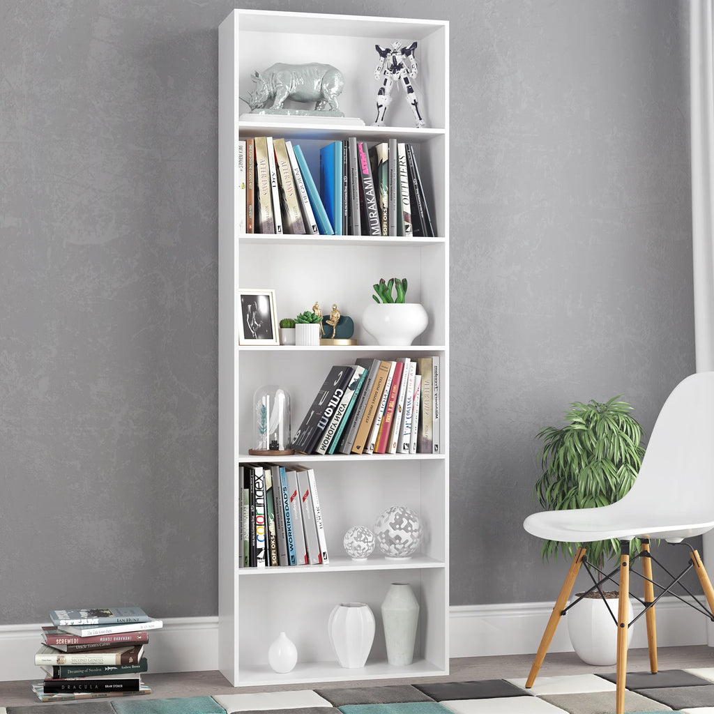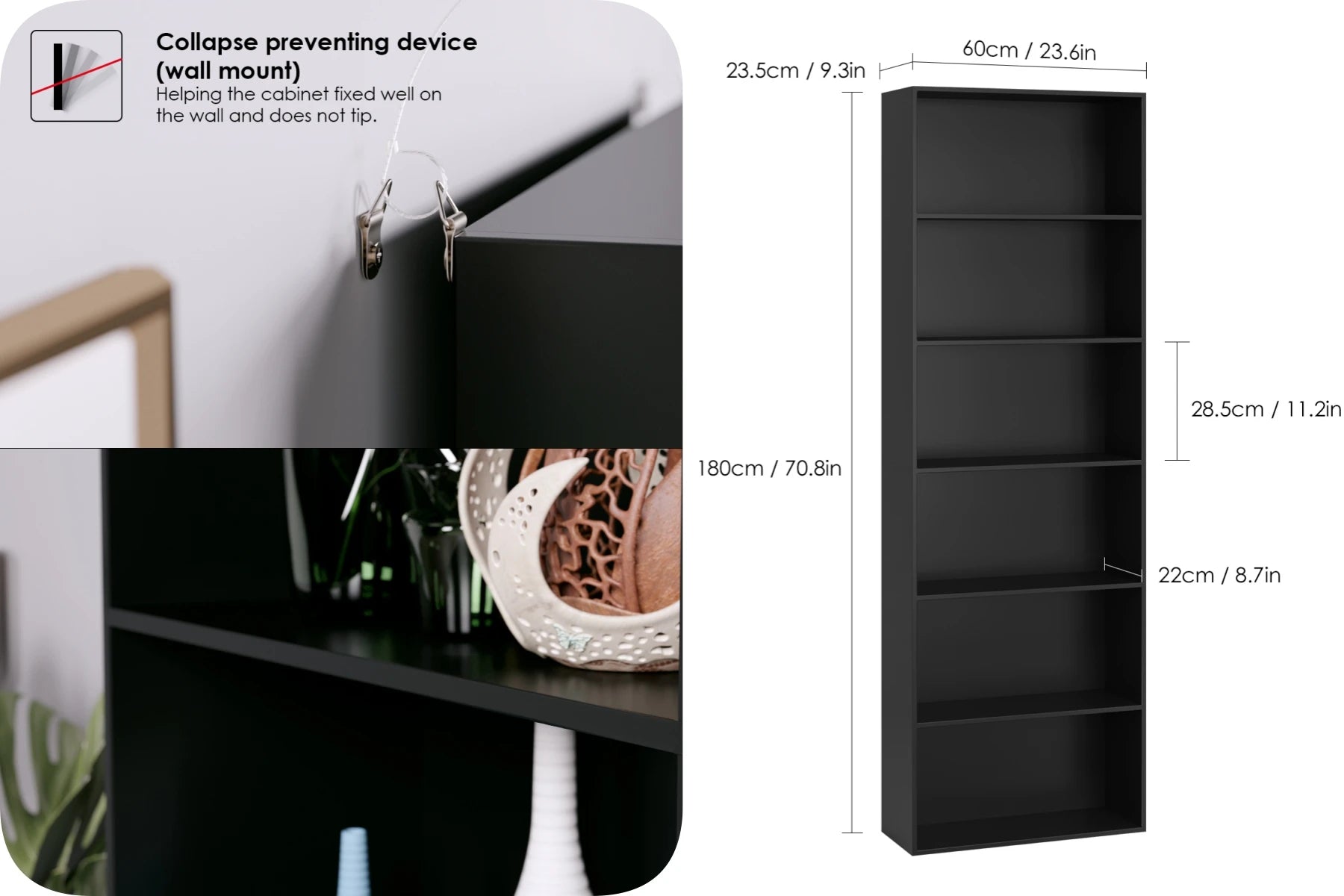 Elevate your living space with this minimalist modern bookcase, offering a sleek and practical solution for your home. Measuring 60x23.5x180 cm, this free-standing bookshelf not only provides ample storage with its six tiers but also fits seamlessly into any modern setting. Perfect for organizing books, displaying picture frames, or storing kitchen utensils, this versatile piece adapts to various needs. Available in white, black, and oak, it can be used individually or in combination to suit your space requirements. Designed for safety, it includes a tilt protection feature to secure it to the wall, ensuring stability and peace of mind.