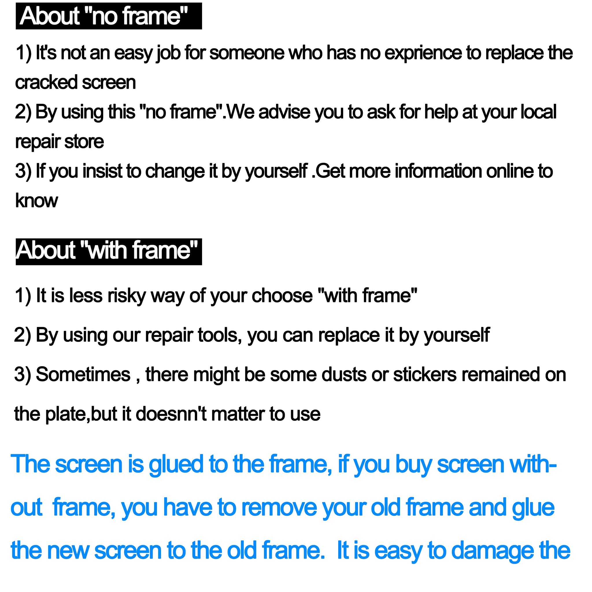 Choose from two options: with frame and no frame. The with frame option simplifies installation and reduces risk, perfect for those who want a DIY approach using our repair tools, although minor imperfections like dust might be present. The no frame option requires more expertise, as the screen must be glued to the existing frame.