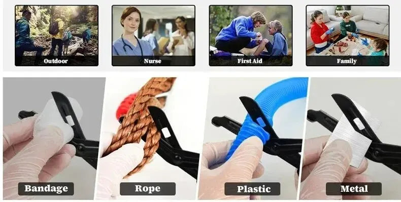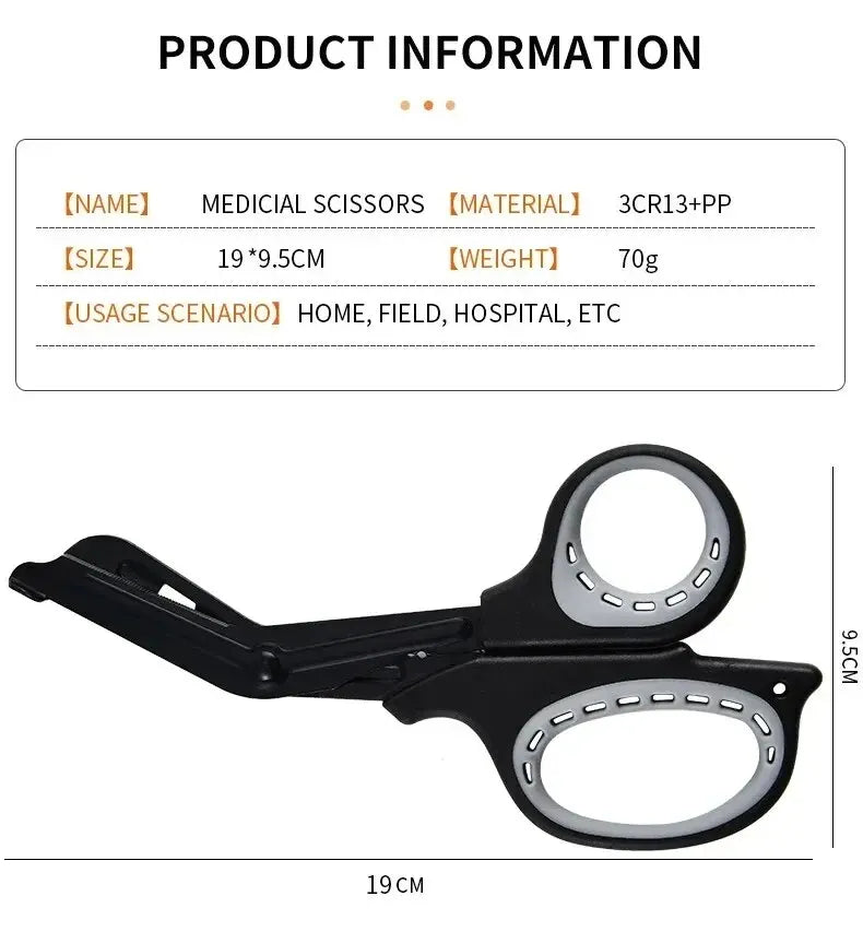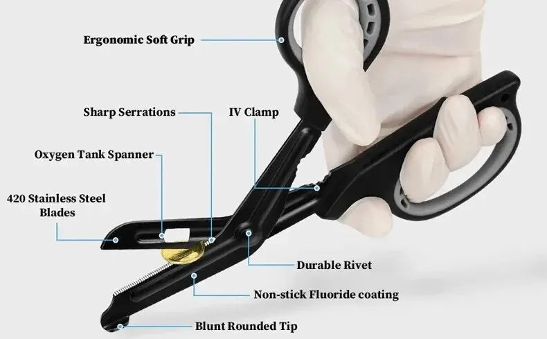 Designed for precision, the thickened and twice-ground blades cut effortlessly through rope, bandages, clothing, denim, belts, leather, polyester, and other tough fabrics. The innovative 7.5-inch design includes an IV clamp and an oxygen tank wrench hole, streamlining functions for healthcare professionals.