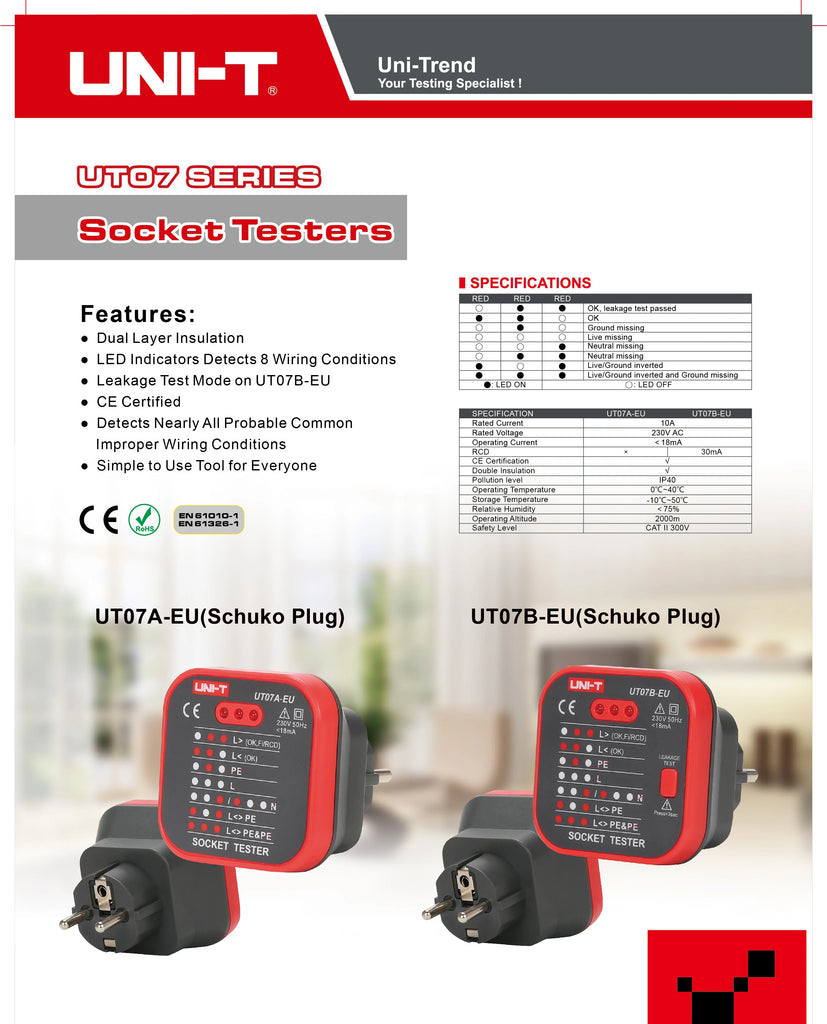 Ensure the safety and accuracy of your electrical installations with the versatile Socket Tester from the renowned UT07 Series. Designed for effortless use, this tester is perfect for quickly identifying wiring issues in standard 230V sockets. Simply plug it in, observe the readings, and compare them with the built-in reference chart. Whether you're a professional electrician or a DIY enthusiast, this tester will help you diagnose and rectify electrical faults with ease.