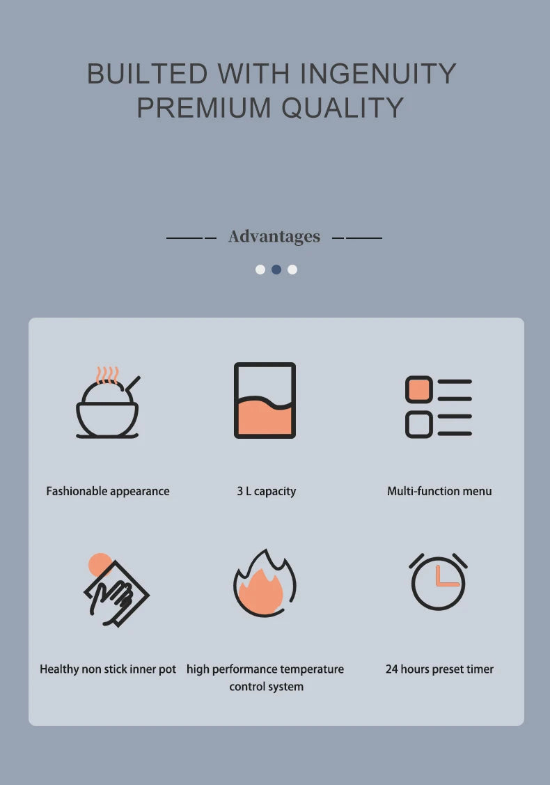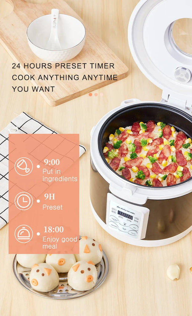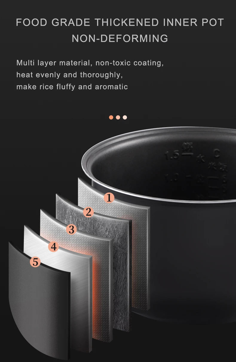 - Functions: Non-water and non-oil fricassee & lobscouse, rice cooking, porridge/soup, coarse cereals, claypot cooked food, heat preservation, fine cook, reheating, stewing