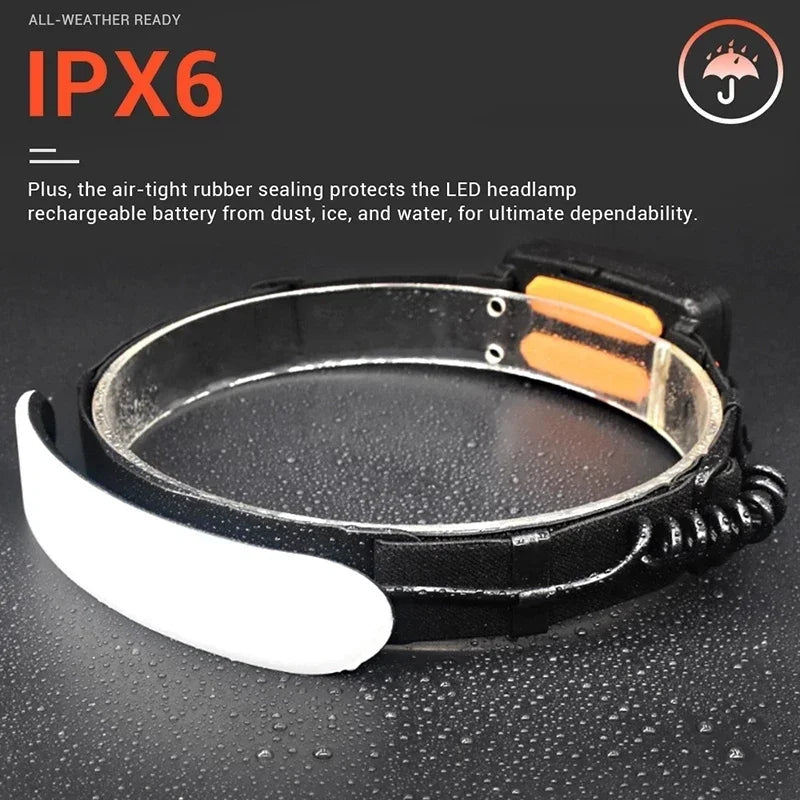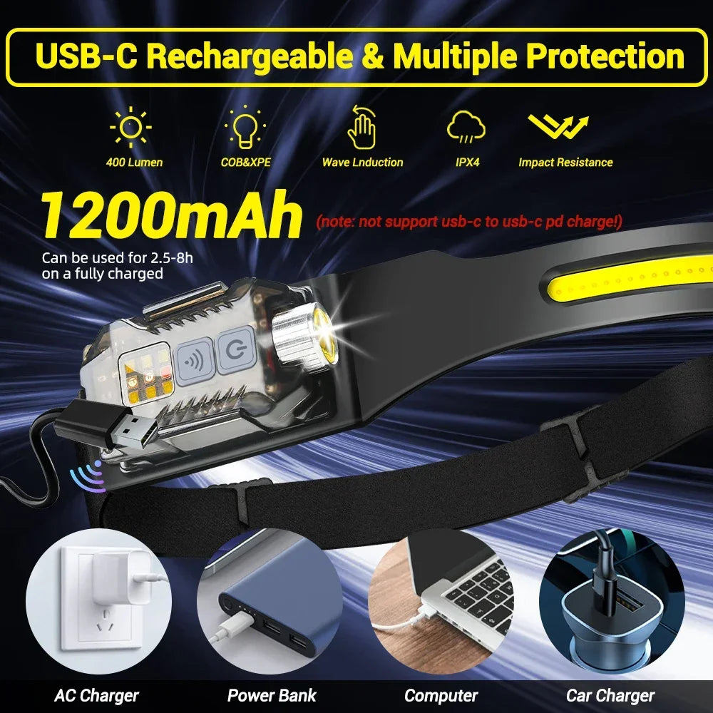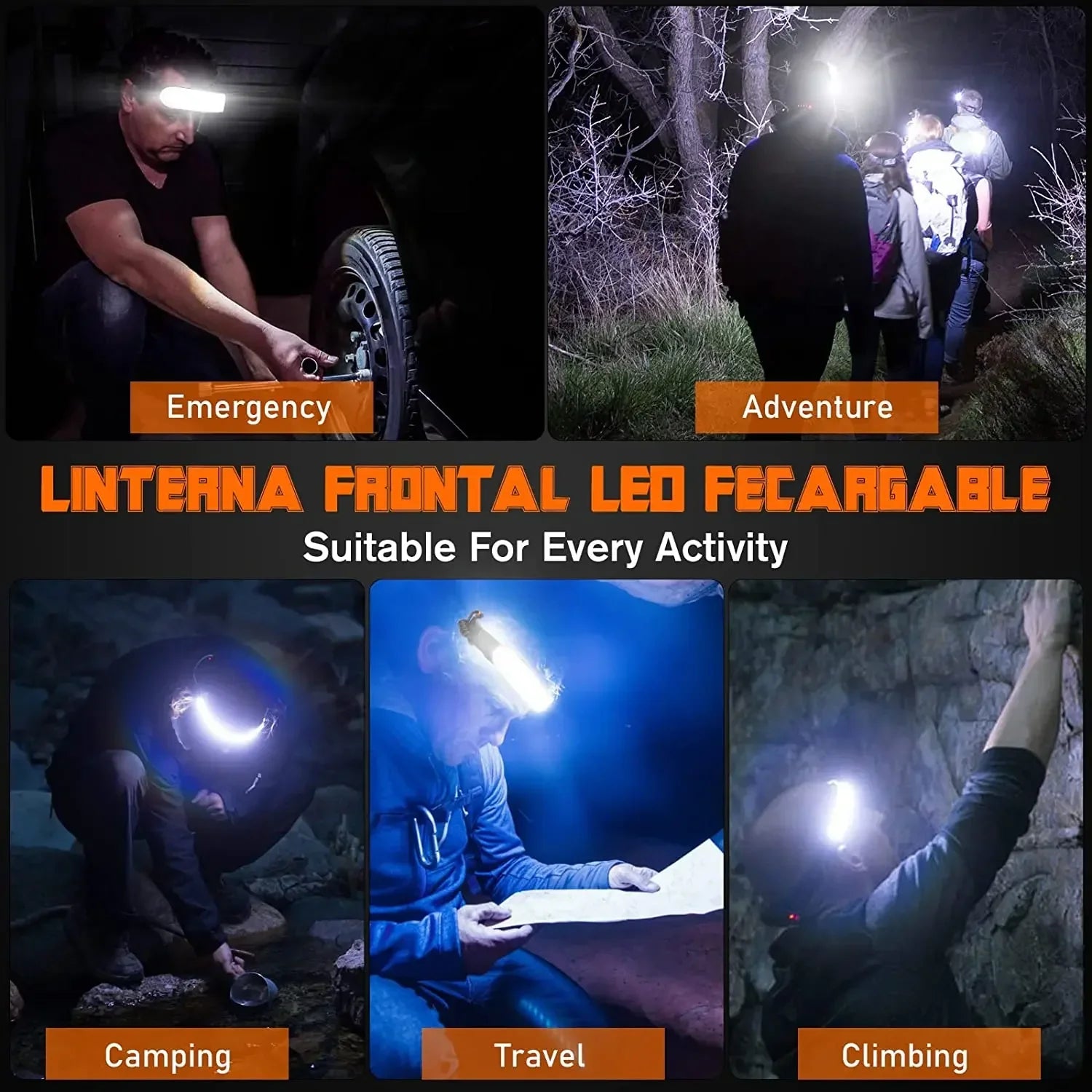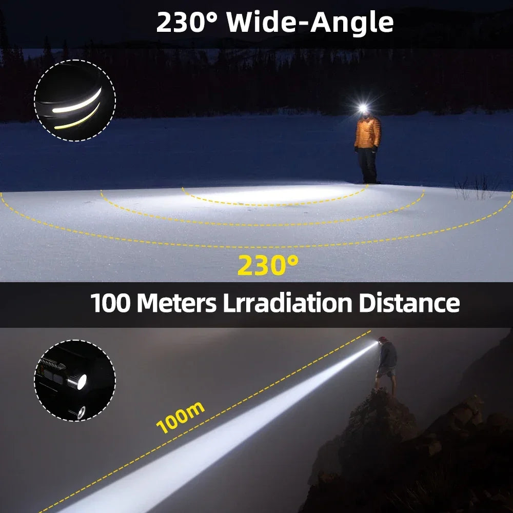 1500lm High Power LED Headlamp, USB Rechargeable COB Flashlight, 7500mAh Battery, Camping & Fishing Torch Lantern