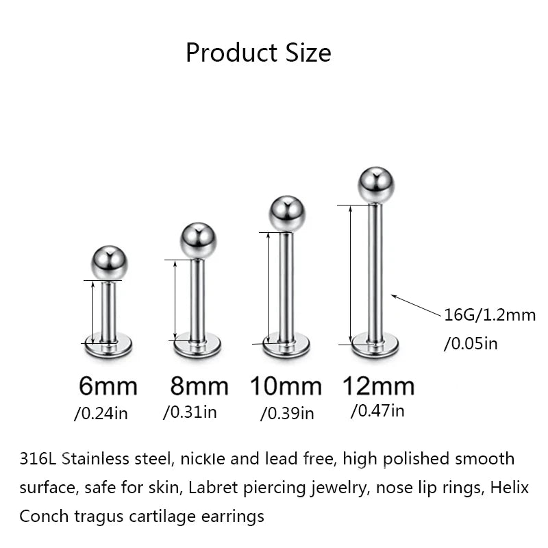Enhance your style with our versatile 15-piece set of stainless steel lip rings. Perfect for labret, lip piercing, Monroe, and cartilage tragus helix earrings, these punk-inspired pieces are crafted from high-quality stainless steel. Designed to suit any occasion, they come in various sizes: 6mm, 8mm, 10mm, and 12mm, allowing for diverse styling options. The simplistic round shape ensures a classic look that complements any fashion sense. Crafted to be both durable and stylish, these lip rings are a must-have addition to your body jewelry collection.