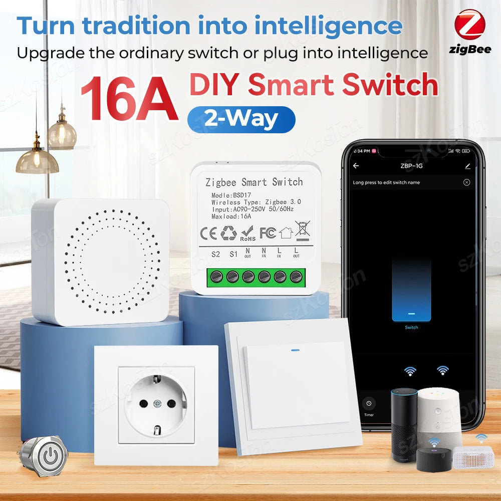 • 16A Zigbee Smart Switch Module for Ewelink, Alexa, Google Home, SmartThings, Zigbee2MQTT - DIY Smart Breaker Relay