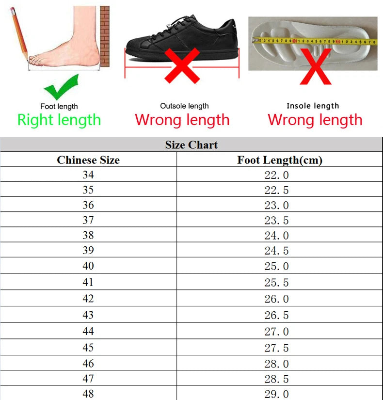 Refer to the sizing chart to ensure the perfect fit according to foot length, ranging from 22 cm to 29 cm. Always measure your foot length for accurate sizing.