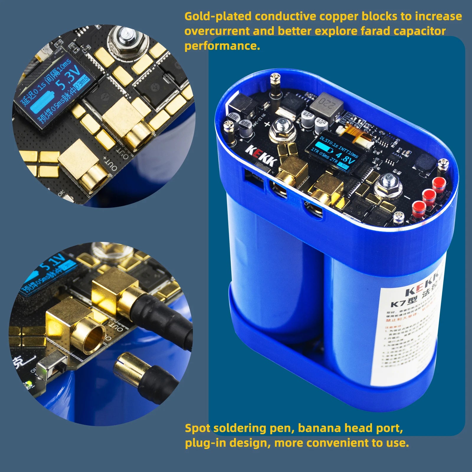 The K7-PRO excels in welding nickel and nickel-plated sheets, handling thicknesses from 0.05mm to 0.3mm. It employs a double pulse technology, offering strong welds on materials like 0.3mm nickel-plated and 0.2mm pure nickel sheets. The tool is equipped with super Farad capacitors that ensure efficient power delivery and voltage balance, complemented by gold-plated conductive copper blocks for optimal current flow.