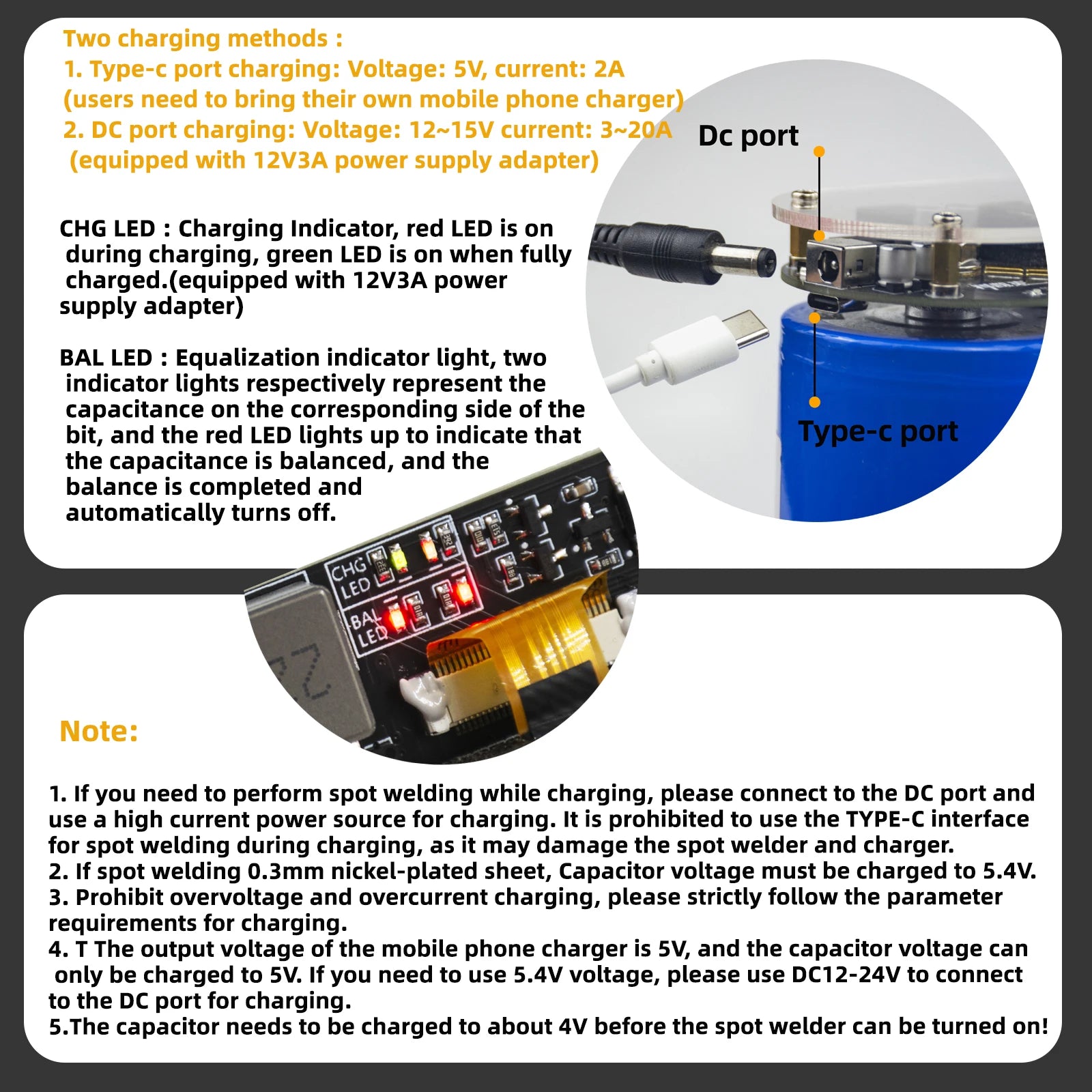 This spot welder includes advanced features such as automatic triggering, multiple MOSFET outputs, and customizable welding modes. With dual charging options via Type-C or DC ports, it's adaptable to various power sources.