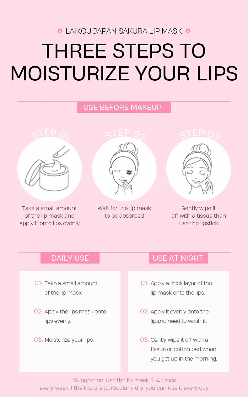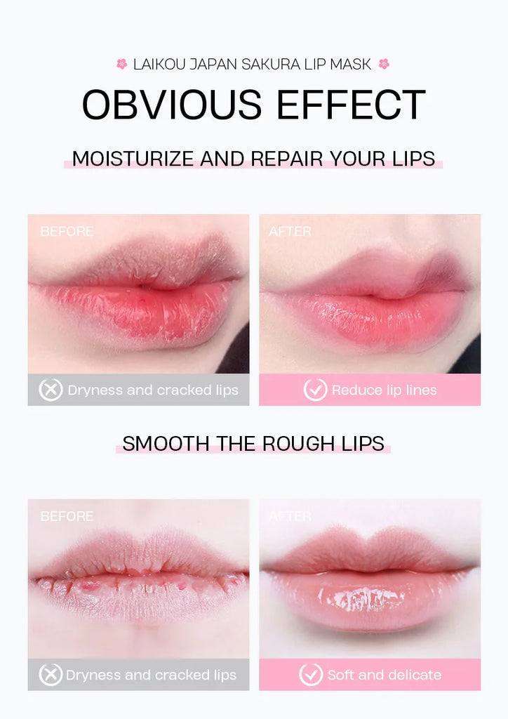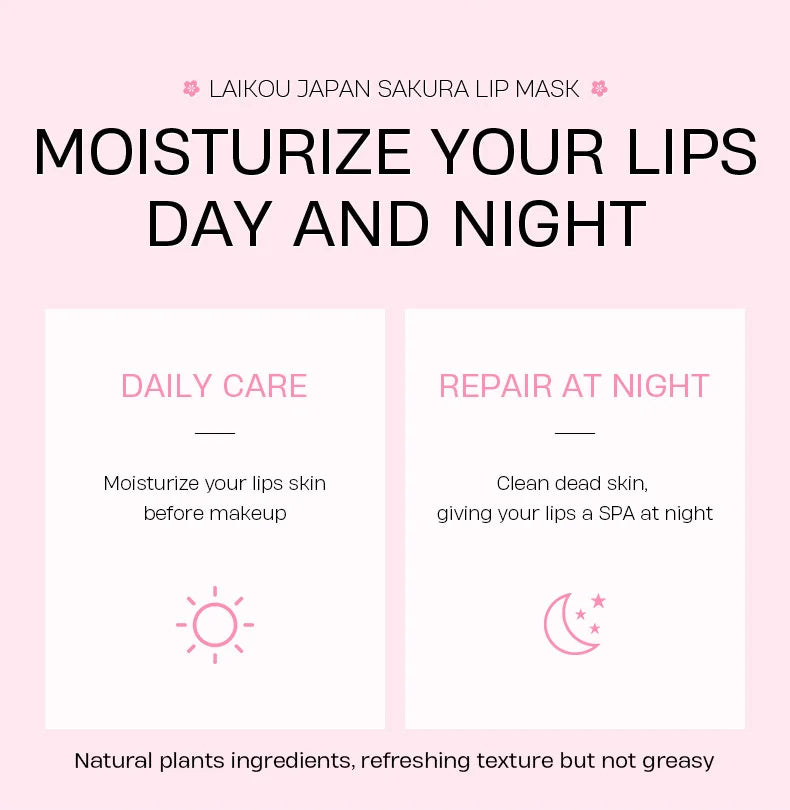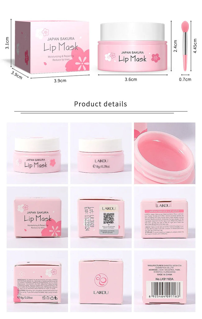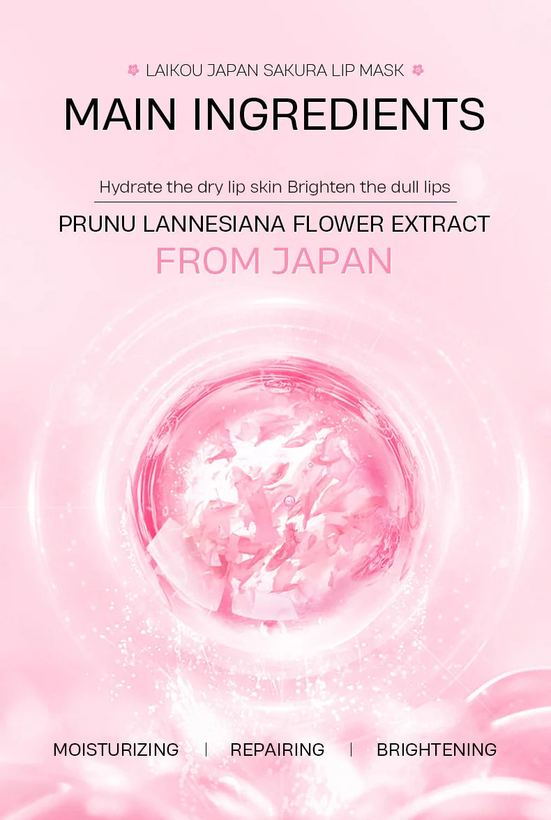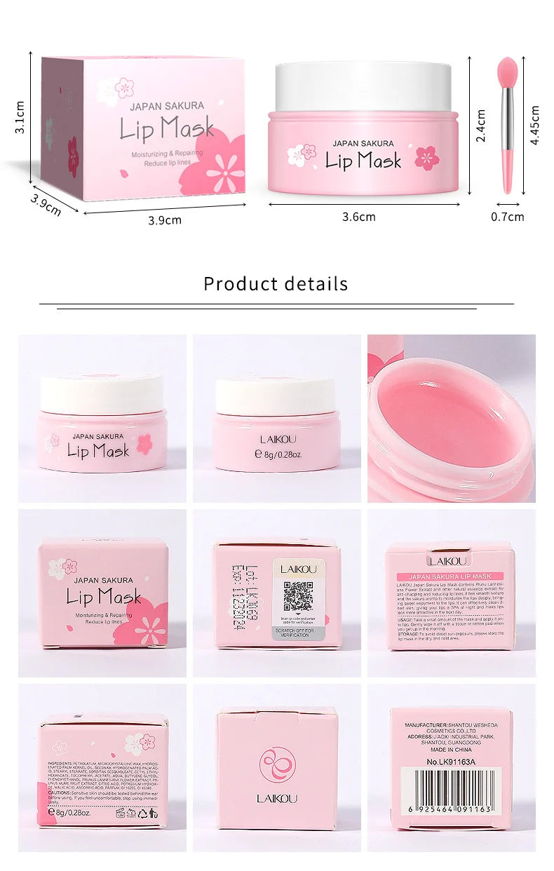 Indulge in the enchanting essence of Japan's Sakura with this luxurious lip mask. Enriched with Prunus Lannesiana Flower Extract and other natural ingredients, it provides deep hydration, minimizing lip lines for a softer, more supple feel. Its rich, soothing texture and calming sakura fragrance elevate your nighttime skincare routine to a spa-like experience, ensuring you wake up with rejuvenated and beautiful lips.