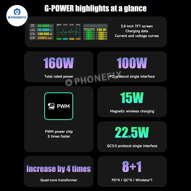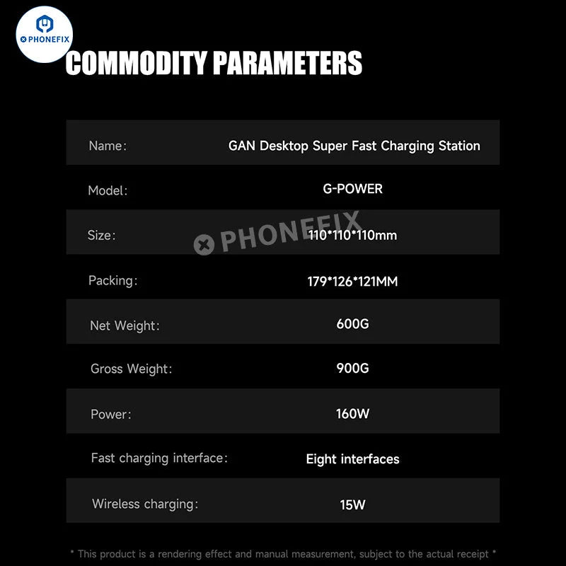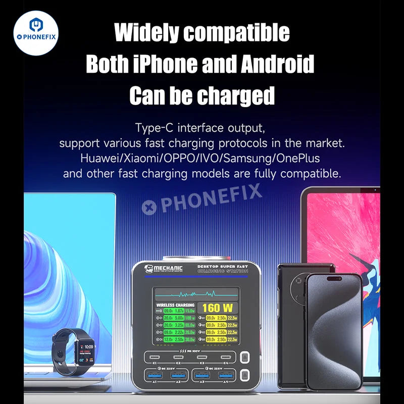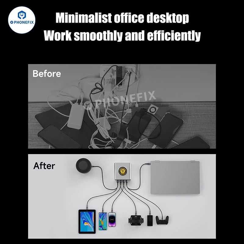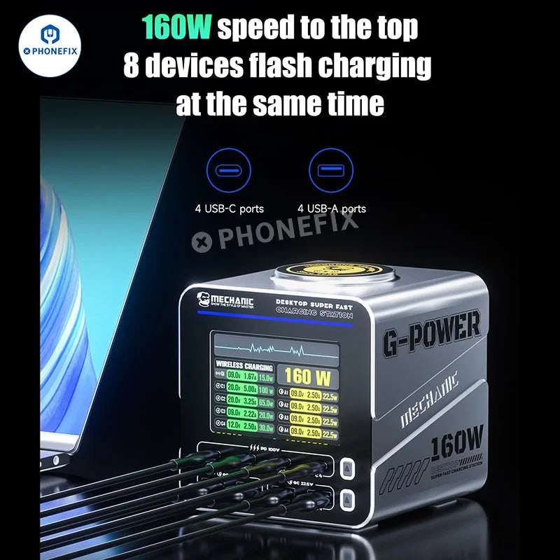 Introducing the ultimate solution for your charging needs: the 160W Desktop GaN Super Fast Charging Station. Perfect for mobile phone repair and everyday use, this powerful charging hub features 8 ports, including 4 USB-C and 4 USB-A, allowing you to charge multiple devices simultaneously. With support for PD and QC charging protocols, it offers efficient and rapid charging for a wide range of devices.