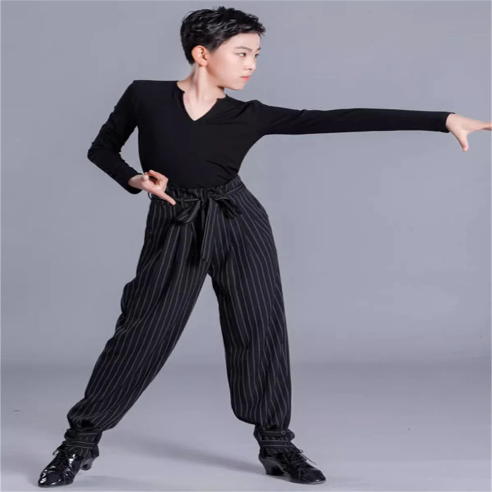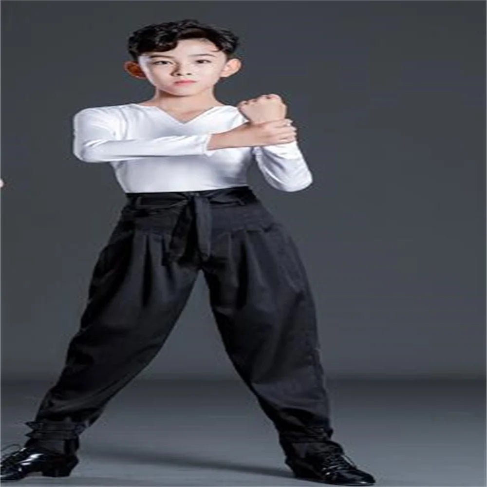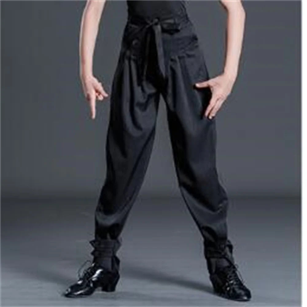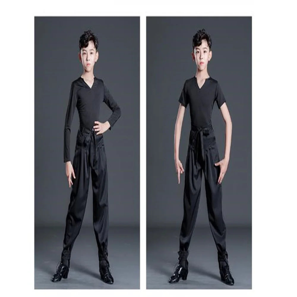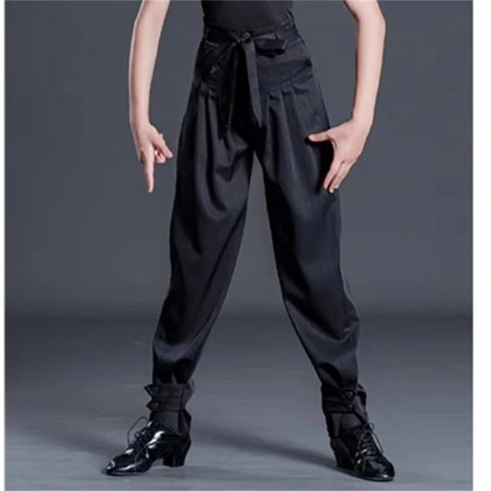Boys Black Latin Ballroom Dance Pants with Lace-up Waist for Cha Cha/Rumba/Samba