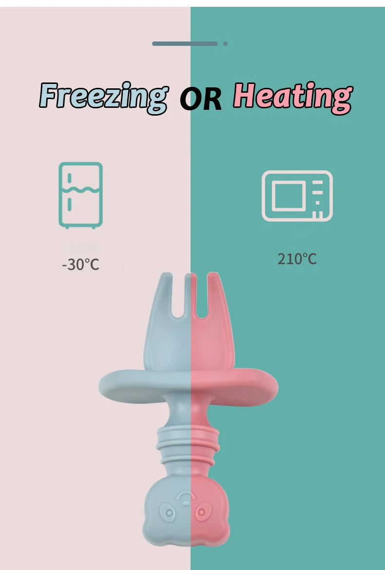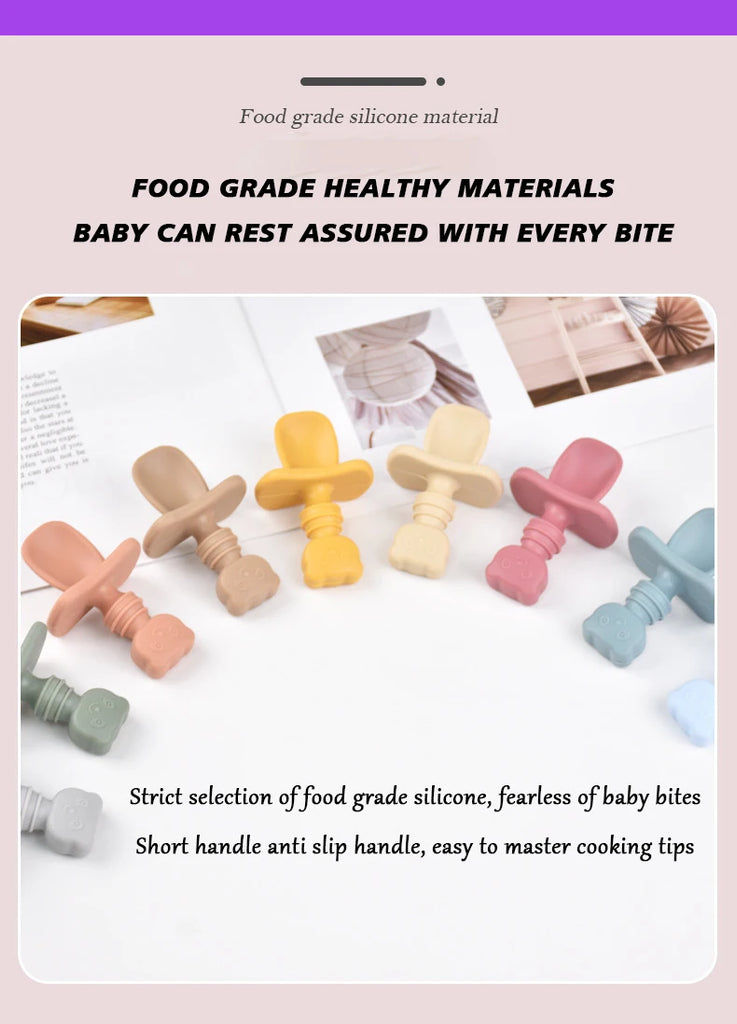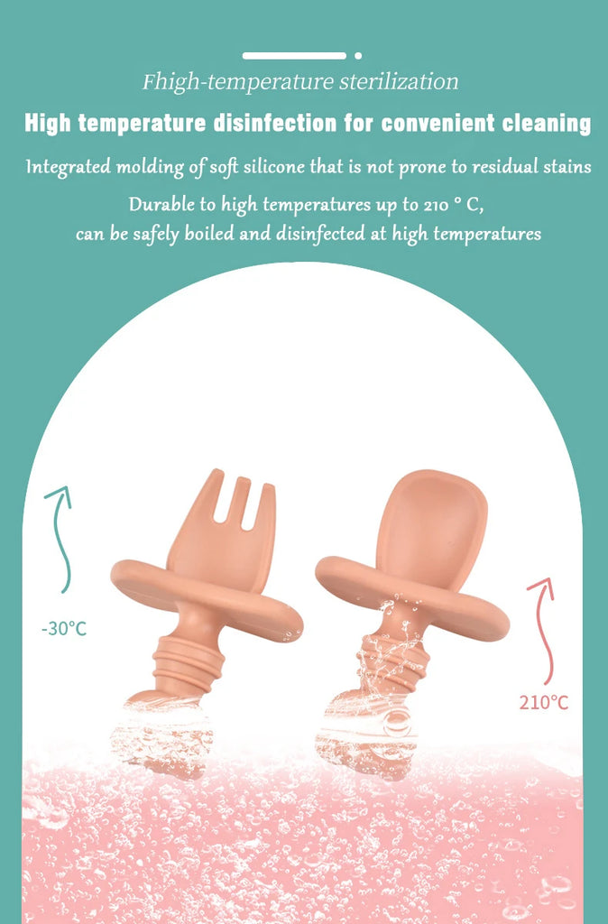 Introducing our premium Silicone Fork and Spoon Set, designed with your child's safety and comfort in mind. Crafted from high-quality, BPA-free silicone, this set is perfectly safe, odorless, and free from harmful substances. The set includes a fork and a spoon, both featuring a smooth, round head to ensure they are gentle on your baby’s mouth. With a safety baffle design, these utensils are tailored to fit comfortably in your baby’s mouth while effectively preventing choking and avoiding throat injuries. Microwave safe, these utensils are perfect for warming meals with ease.