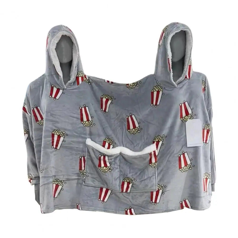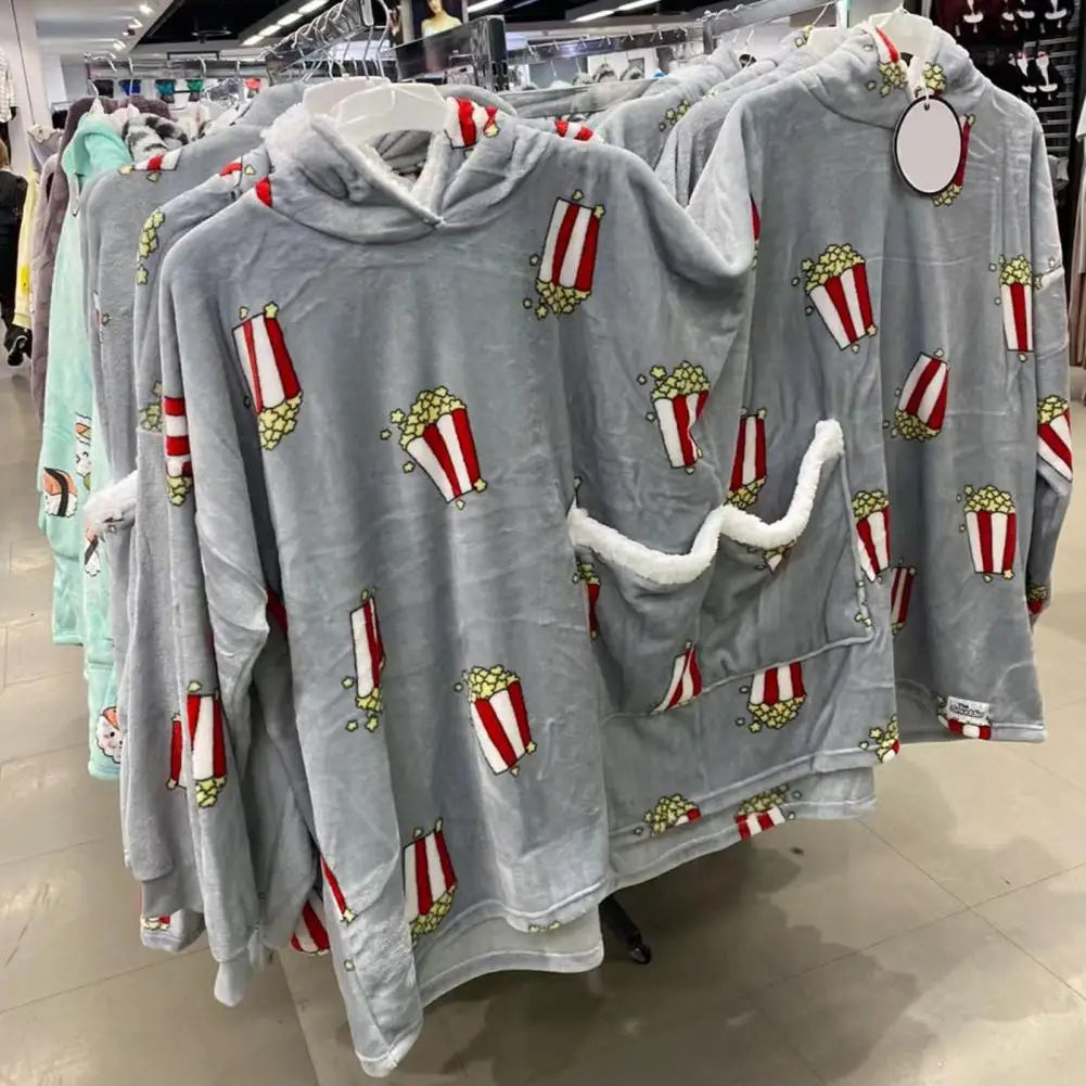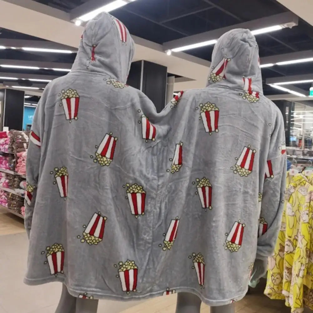 Couples Hooded Popcorn Print Plush Pajamas with Double Pocket, Thick Long Sleeve Bathrobe, Oversized Comfy Loungewear