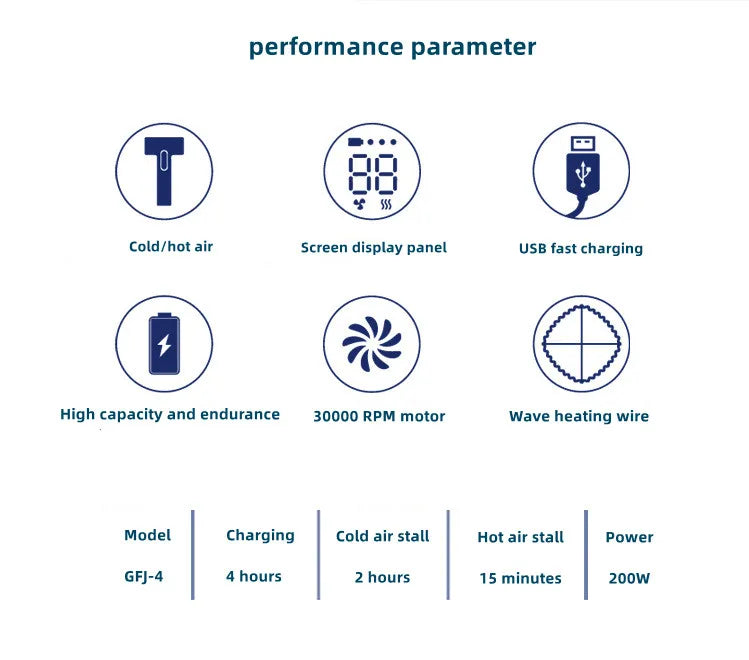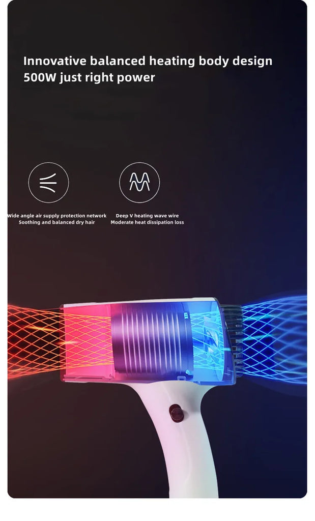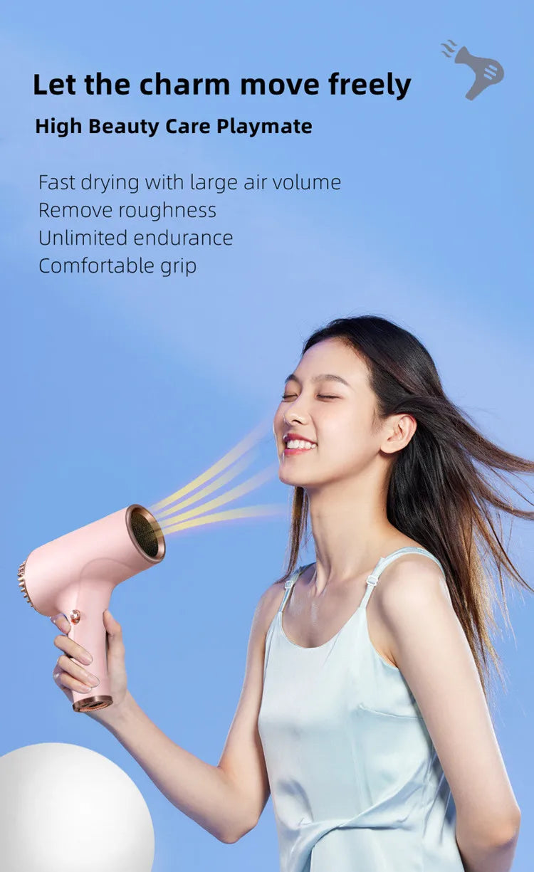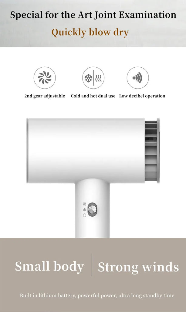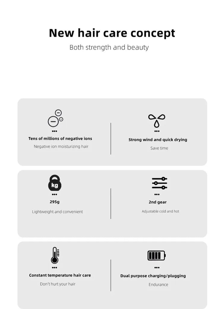 Introducing the innovative Wireless Hair Dryer, perfect for professional styling at home or on the go. With a high-speed brushless motor reaching 30,000 RPM, it offers efficient drying with minimal noise. Enjoy the flexibility of USB fast charging and dual voltage capabilities, making it ideal for travel. The 3rd gear wind power and temperature settings provide precise control for all hair types, while the alternating cold and hot air function ensures optimal hair health. Designed with overheat protection and a sleek ABS shell, this dryer combines safety with style.