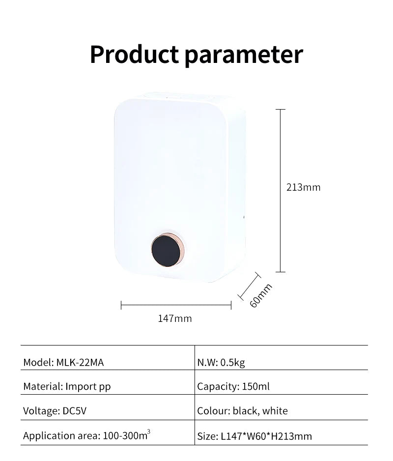 Introducing our sleek and modern scent diffuser, designed to elevate your living space with your favorite fragrances. With a capacity of 150ml, this diffuser gently disperses essential oils, creating a soothing atmosphere that enhances relaxation and well-being. Available in sophisticated black and white, it seamlessly blends with any decor. Crafted from premium imported PP material, it is both durable and lightweight at just 0.5kg. The compact design, measuring L147*W60*H213mm, ensures it fits perfectly in any room without taking up much space. Featuring CE and FCC certifications, you can trust in its quality and safety. It operates efficiently with a DC12V power supply, making it an excellent choice for your home or office.