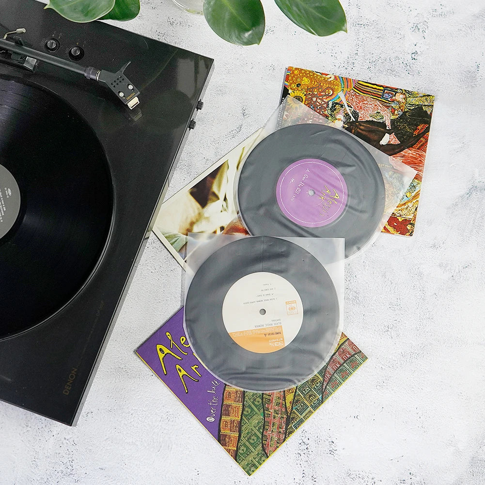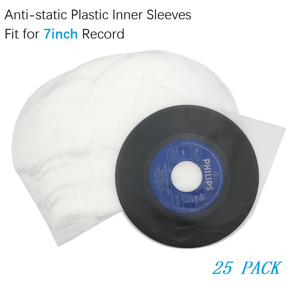 Enhance the longevity and appearance of your vinyl records with our premium clear protective sleeves. Crafted from high-quality LLDPE material, these sleeves are designed to be dustproof and offer superior protection. Sized at 7 inches by 7.3 inches (17.8cm x 18.6cm) with a double-sided thickness of 3 mil, these sleeves are perfect for safeguarding your bare 7 LPs. Available in sets of 25 or 50 pieces, they provide a reliable solution for any vinyl enthusiast. No seal ensures easy access and handling for your collection.