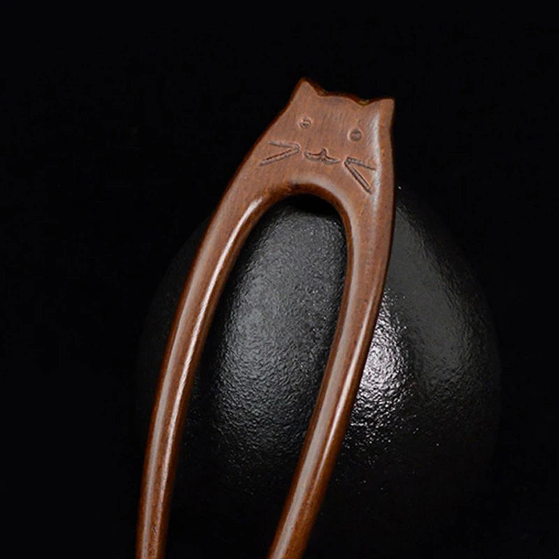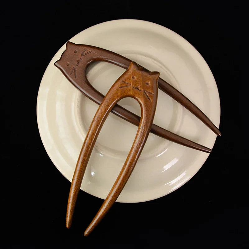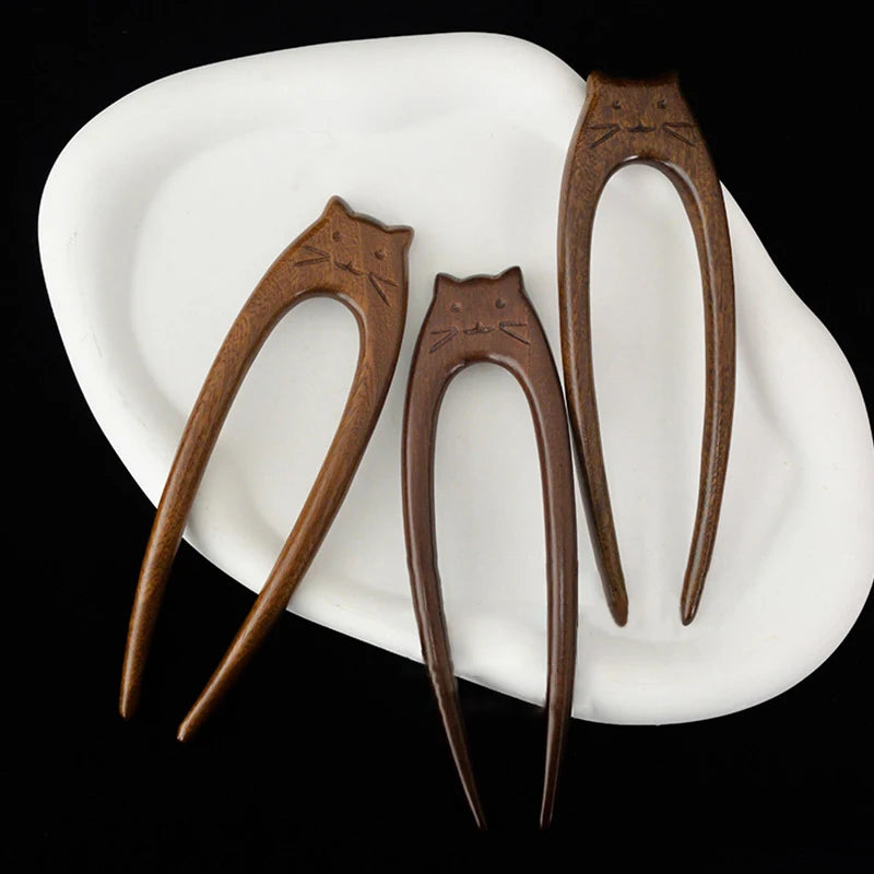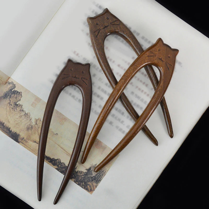 Chinese Cat Pattern Wooden Hair Sticks U-Shaped Hair Forks Hanfu Headwear Accessories for Women