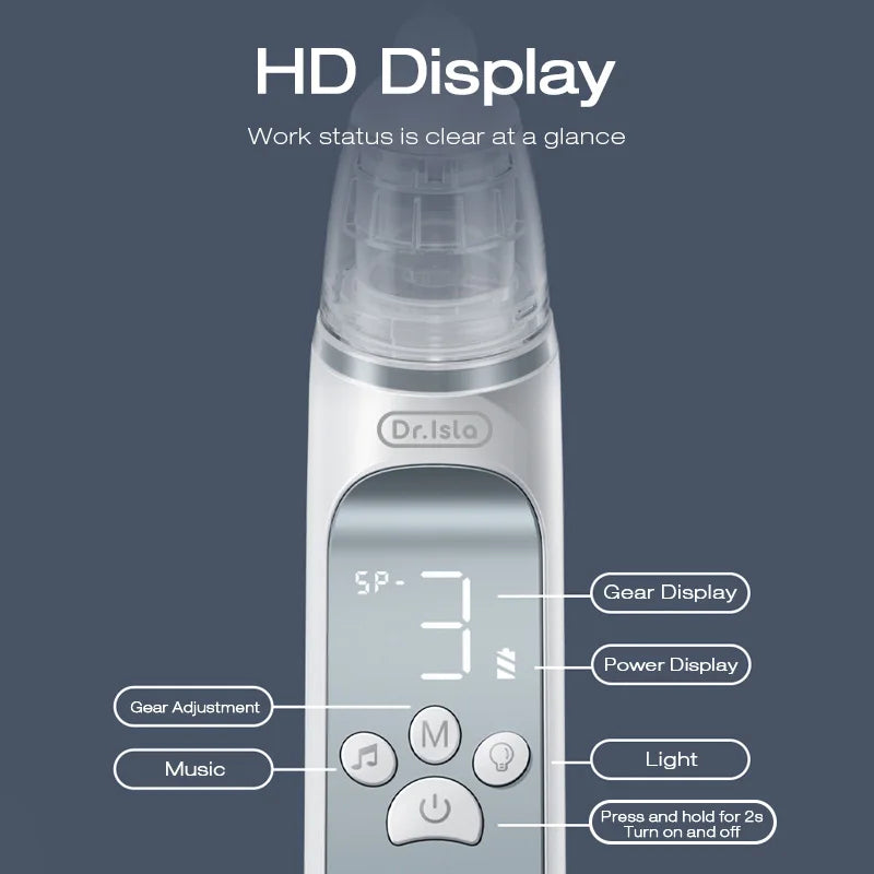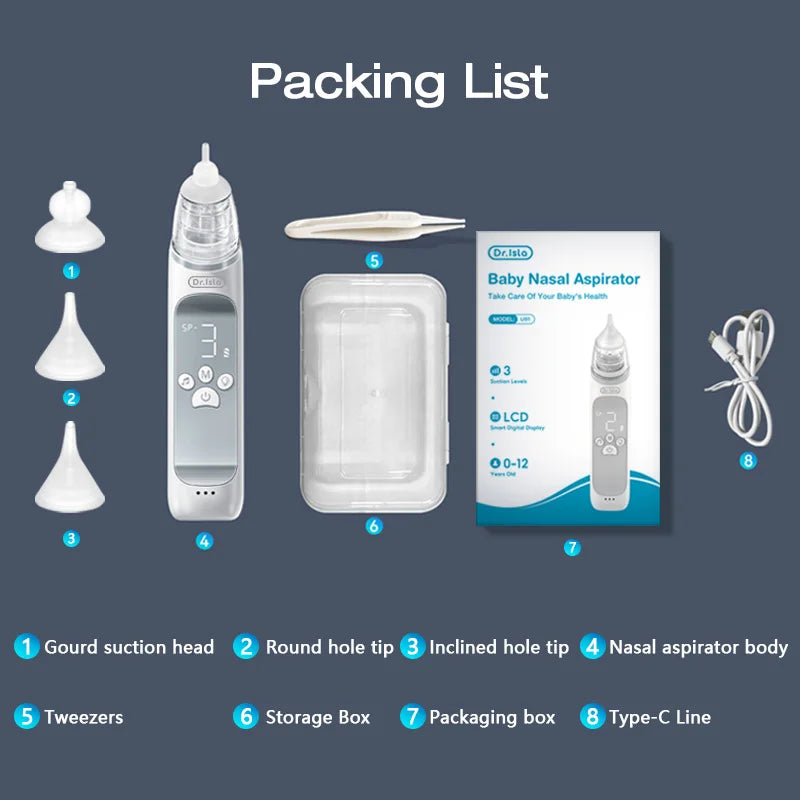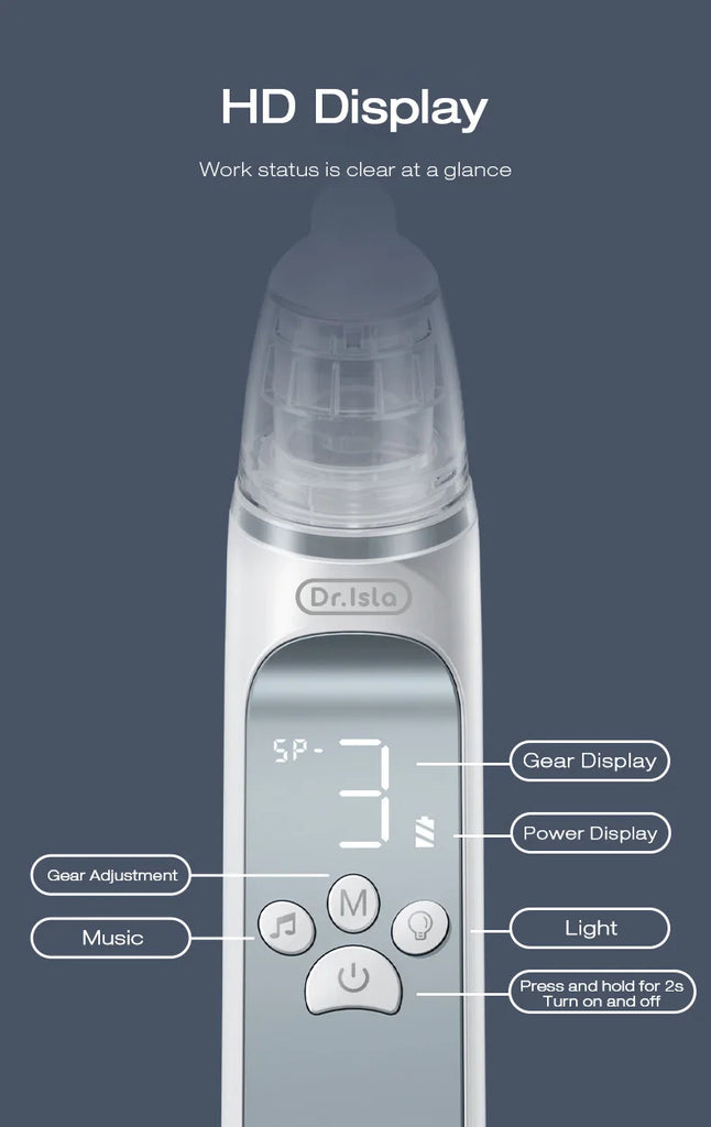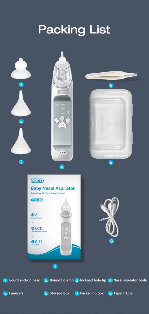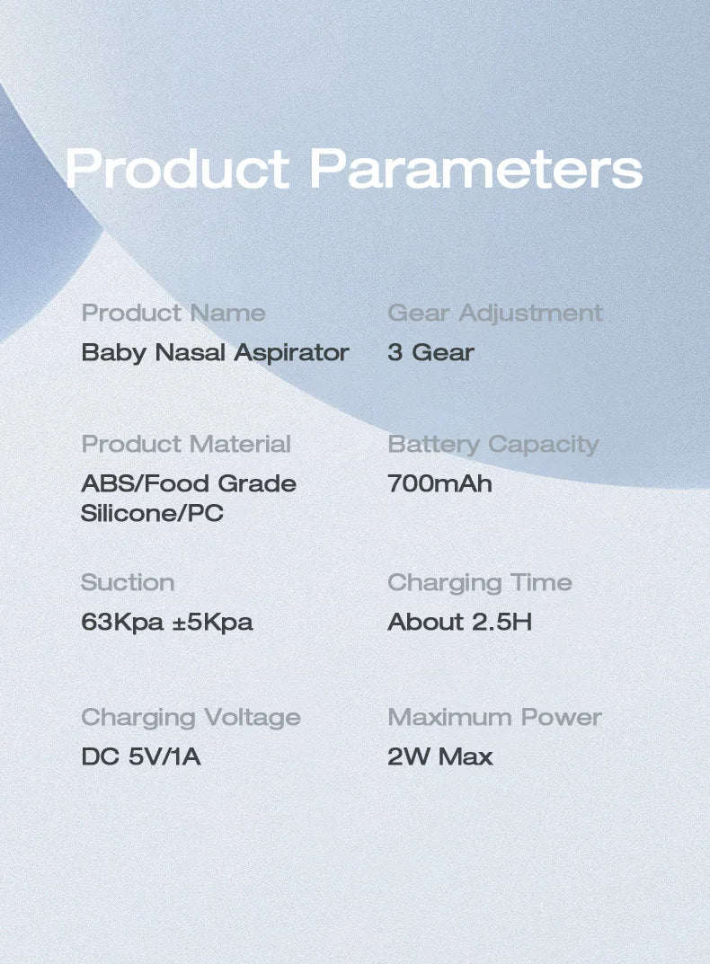 The aspirator is equipped with three adjustable suction levels, making it easy to clear mucus and alleviate congestion. Its ergonomic shape, LCD display, and soothing light and music functions create a calming experience for your child, while reducing noise.