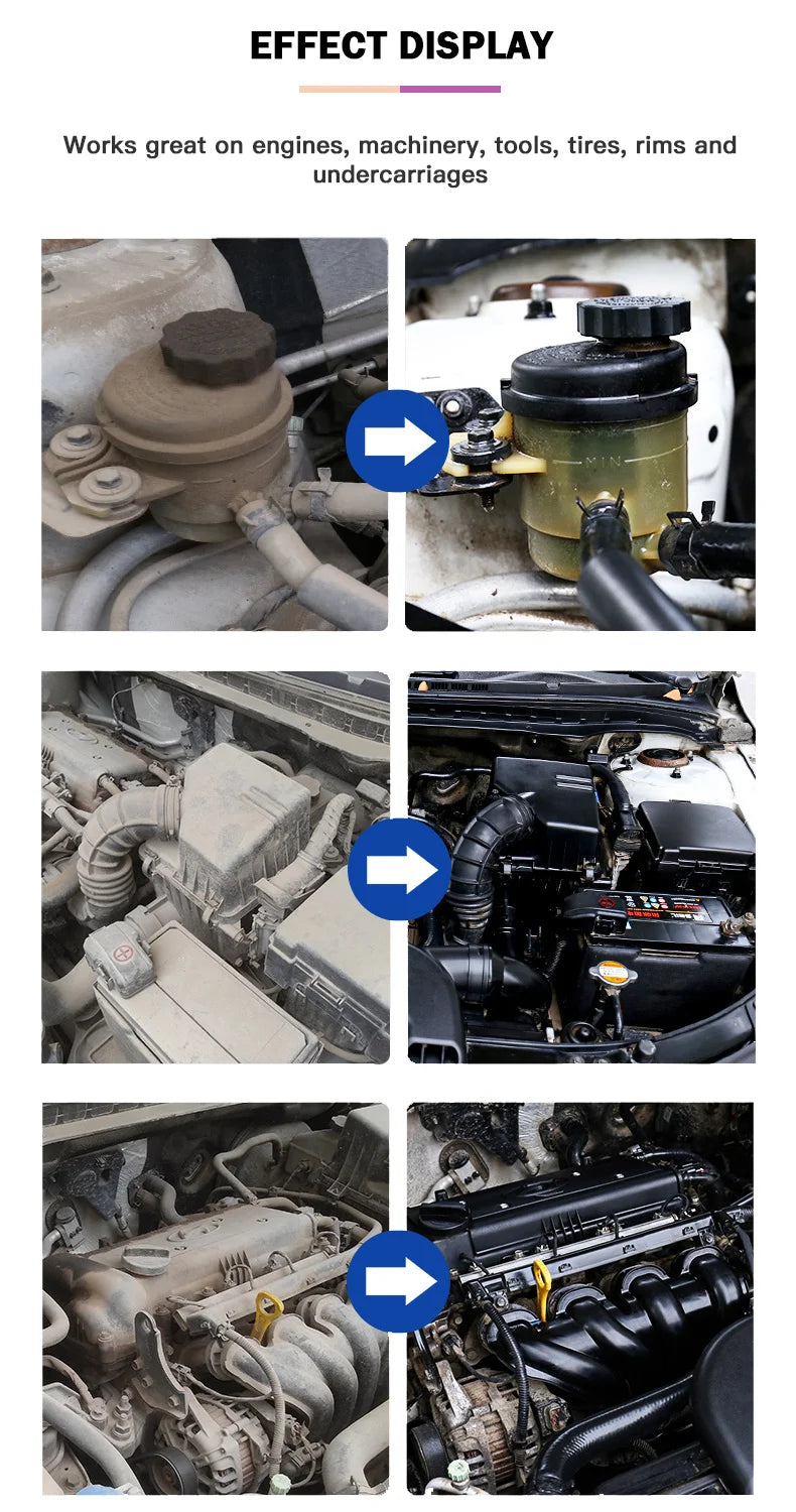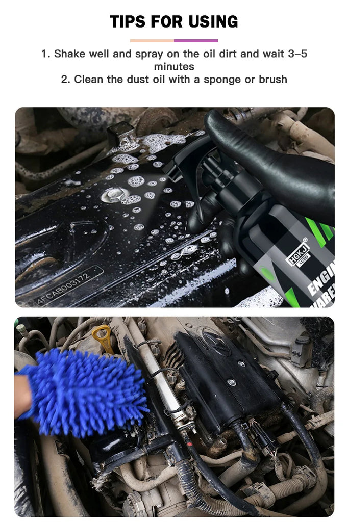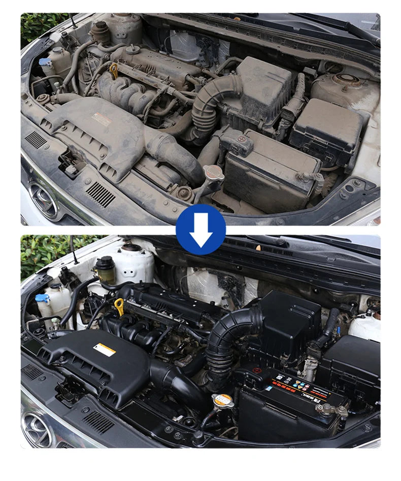 Introducing an effective solution for keeping your vehicle's engine bay spotless. This powerful cleaner is designed to remove heavy oil, dust, and grime, ensuring your engine compartment stays in top condition. It penetrates deeply to tackle tough grease and oil stains, leaving behind a protective layer that keeps surfaces shining longer.