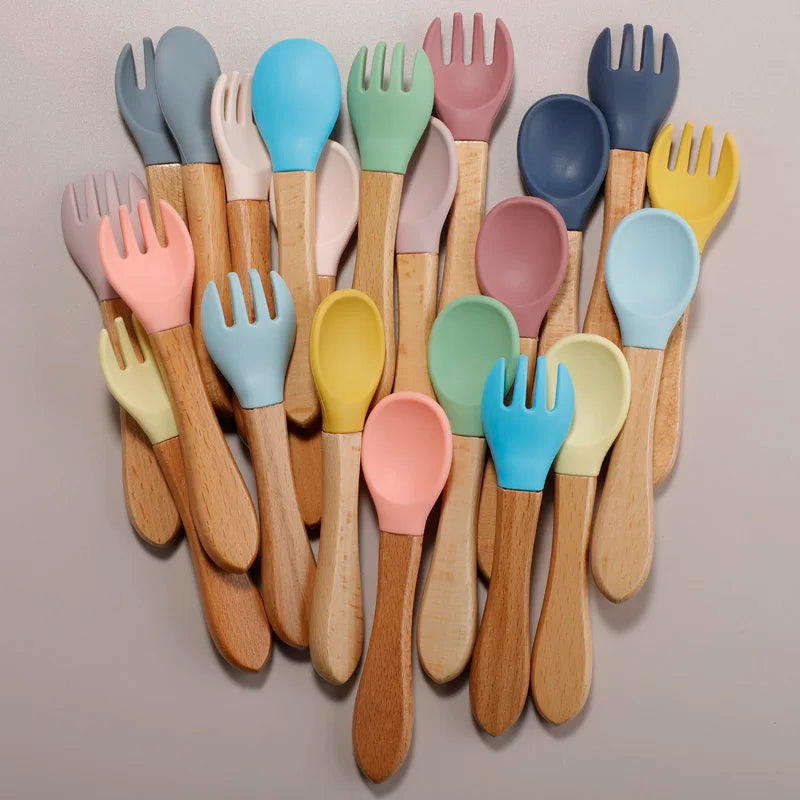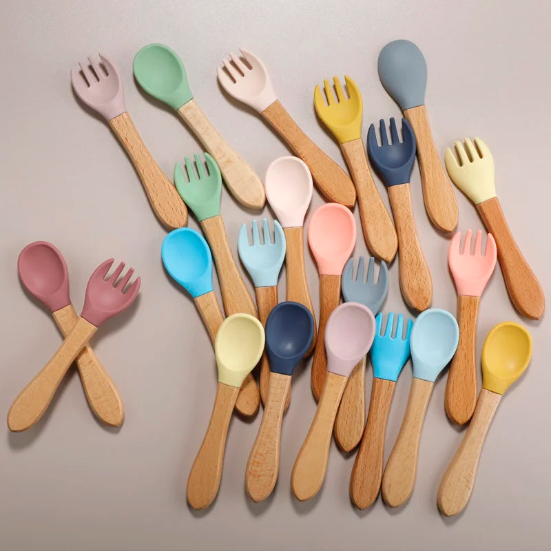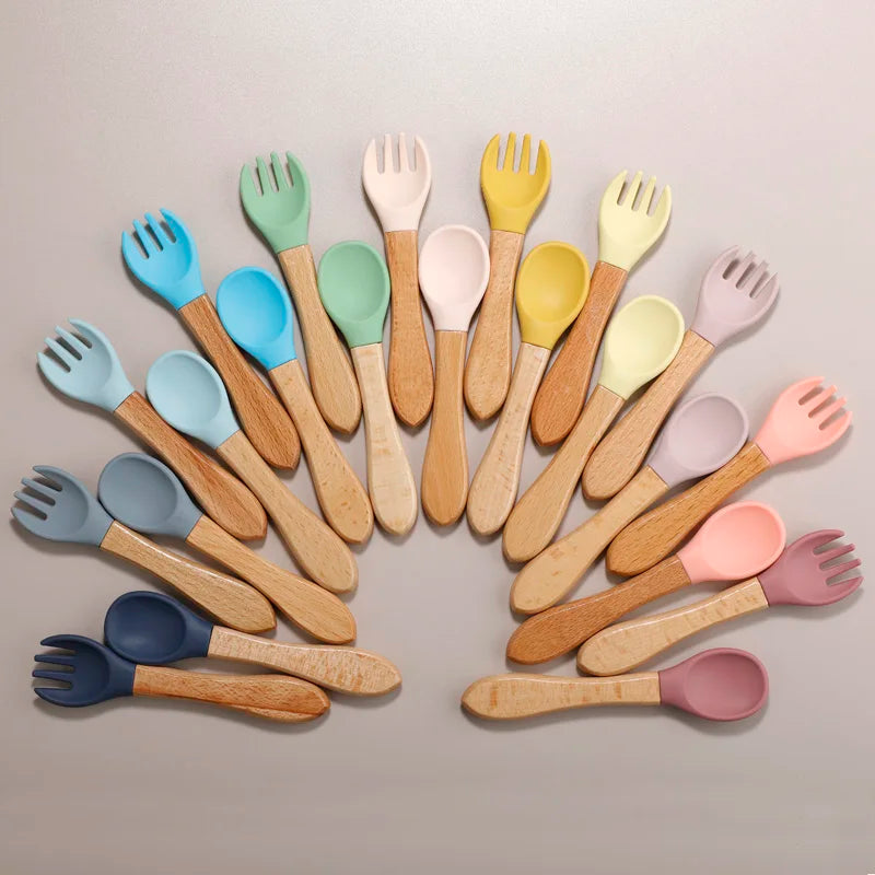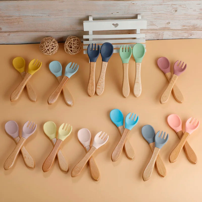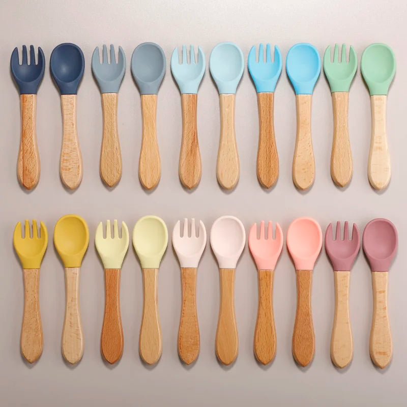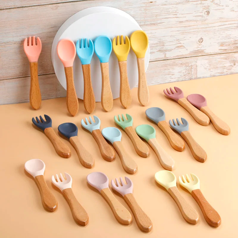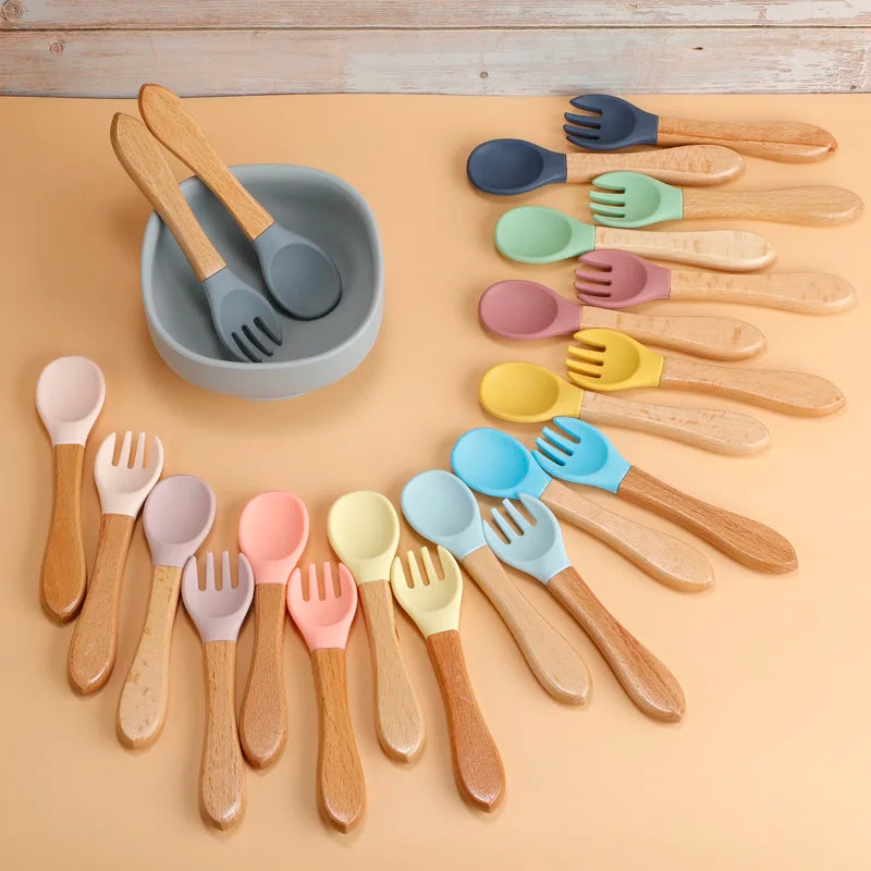 Baby Silicone Feeding Fork & Spoon Set with Wooden Handle - Perfect Gift for Christmas or Birthday