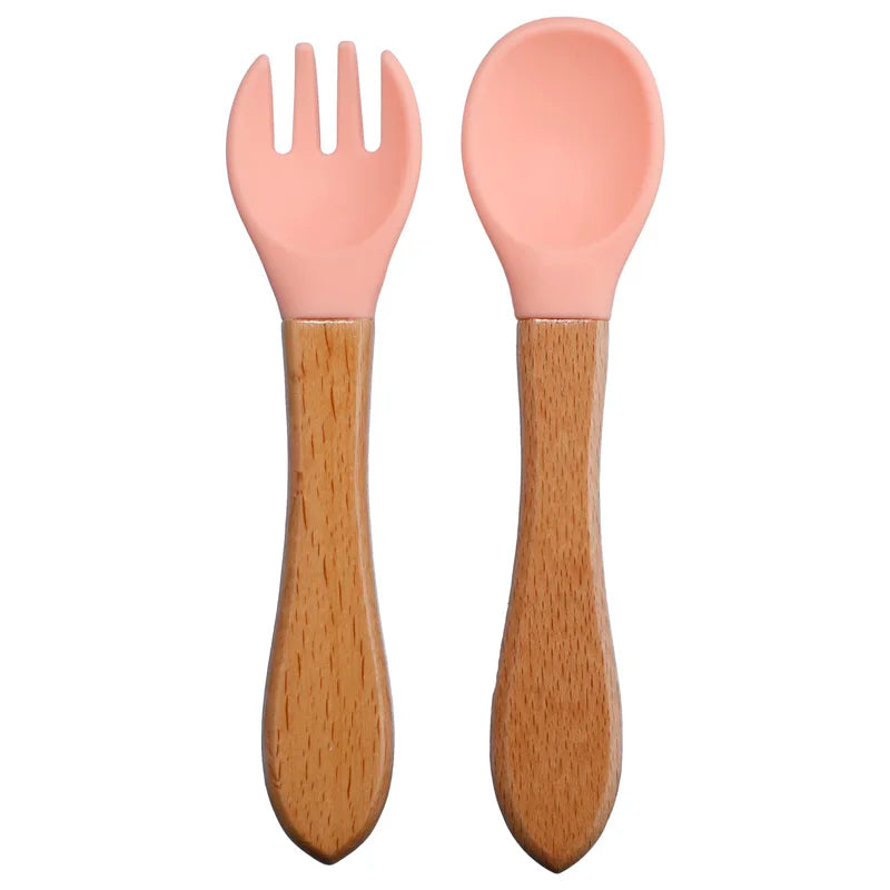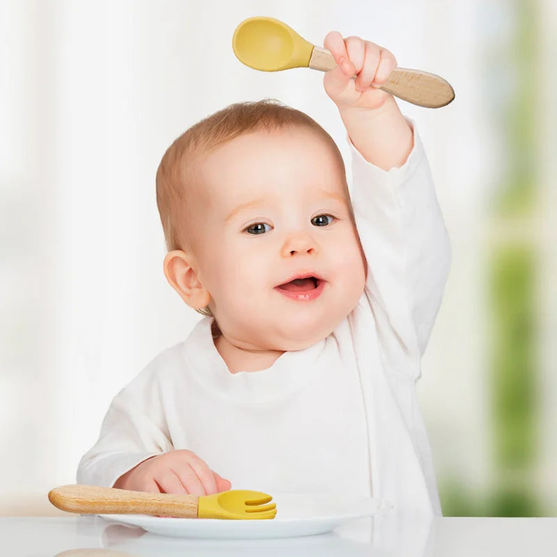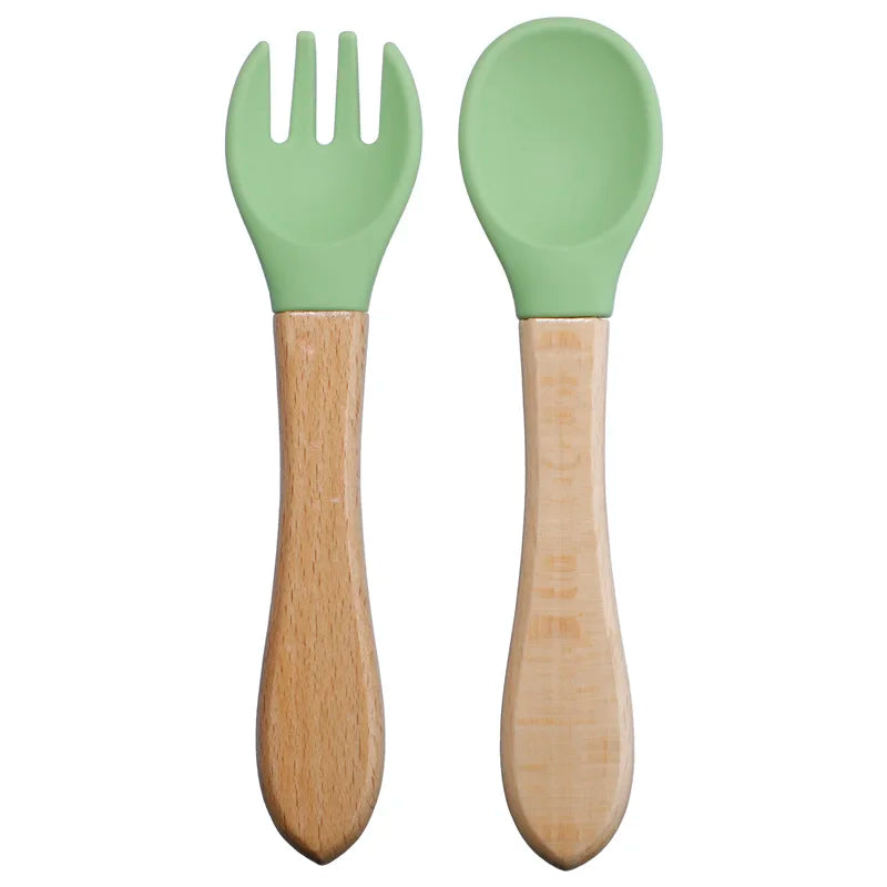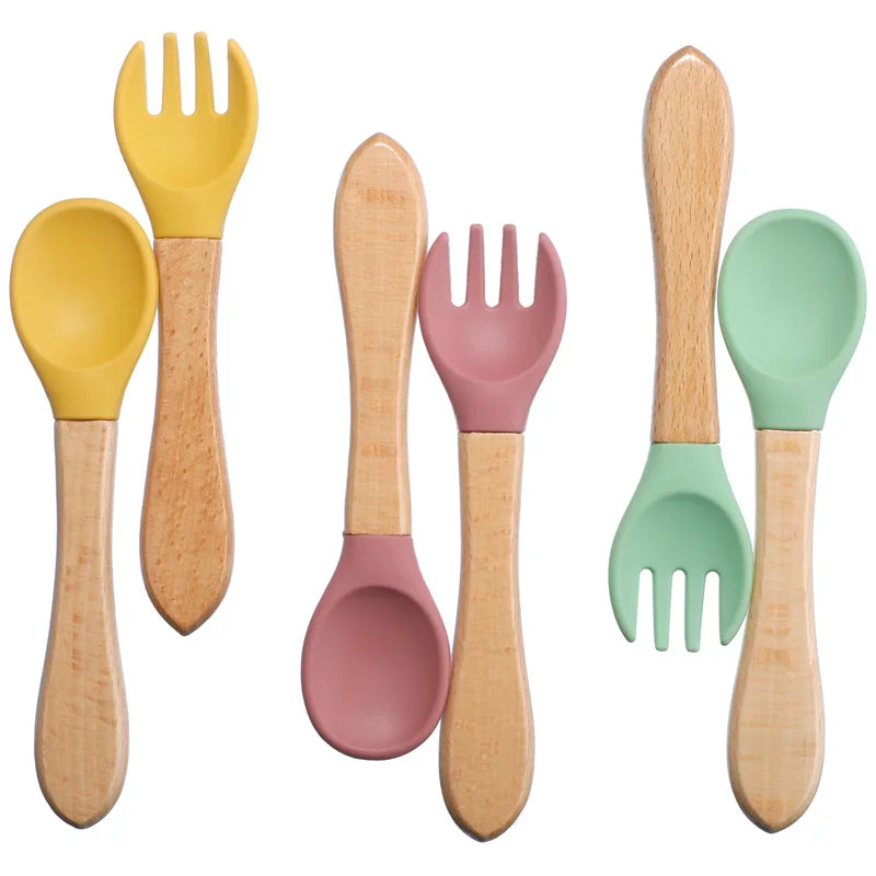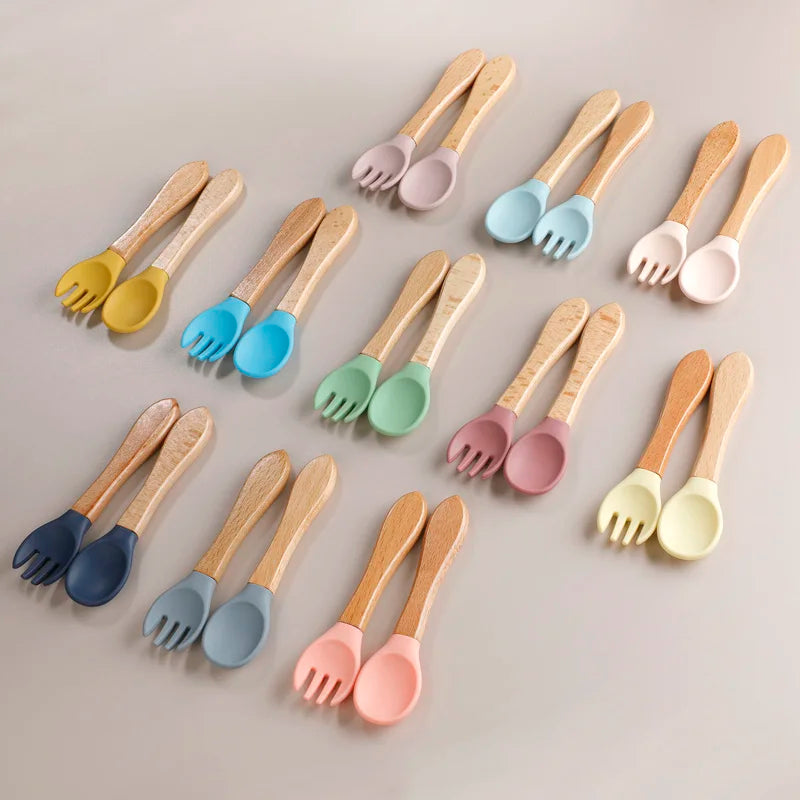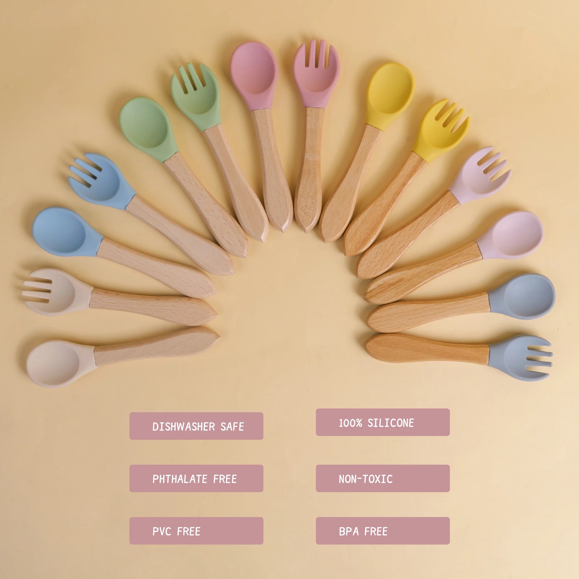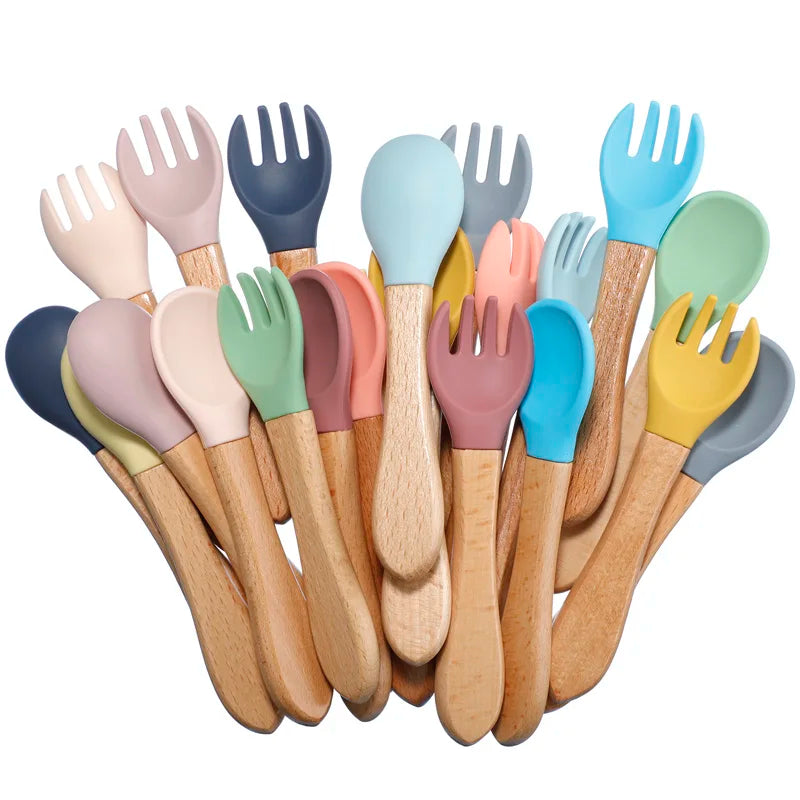 Baby Silicone Feeding Fork & Spoon Set with Wooden Handle - Perfect Gift for Christmas or Birthday