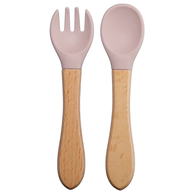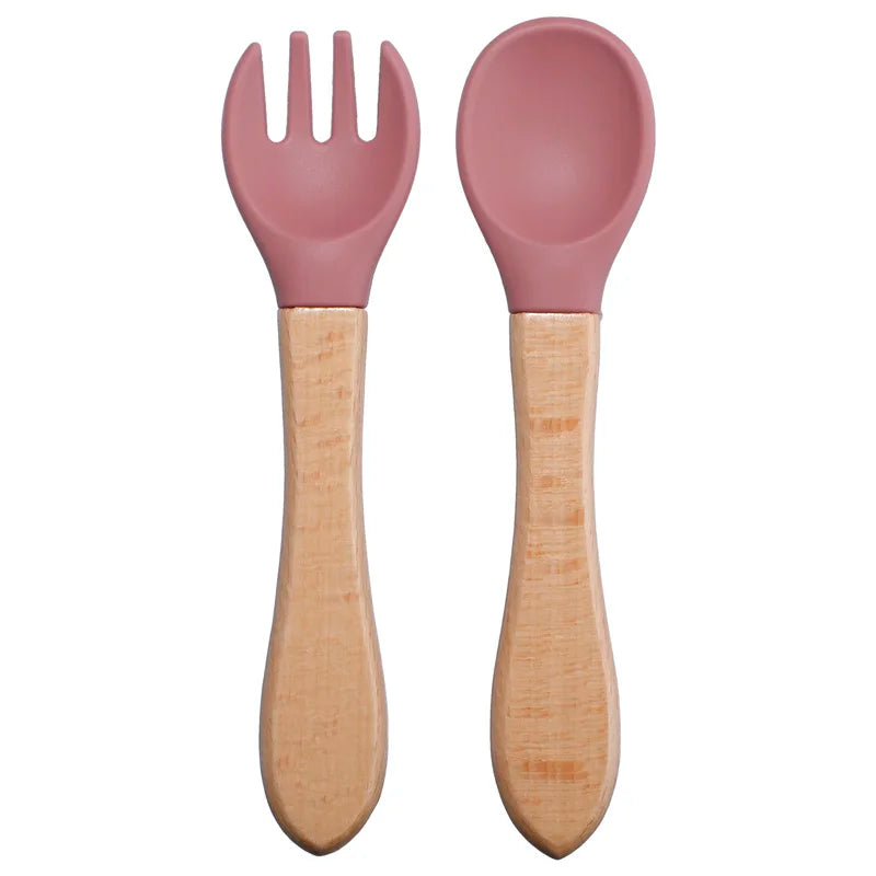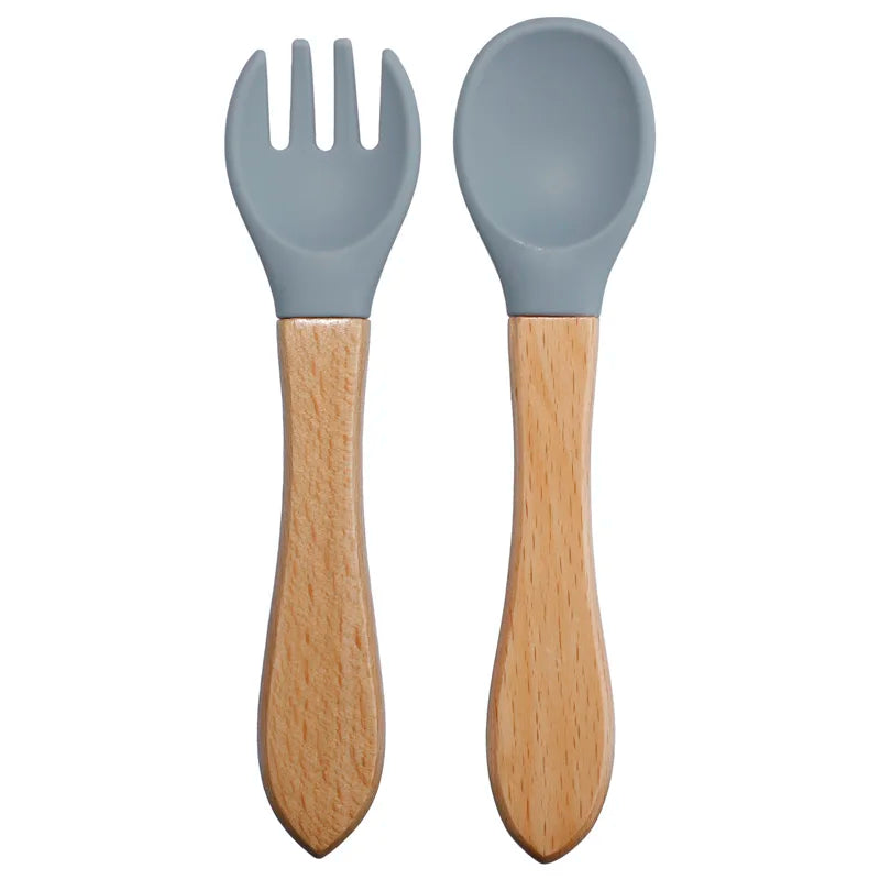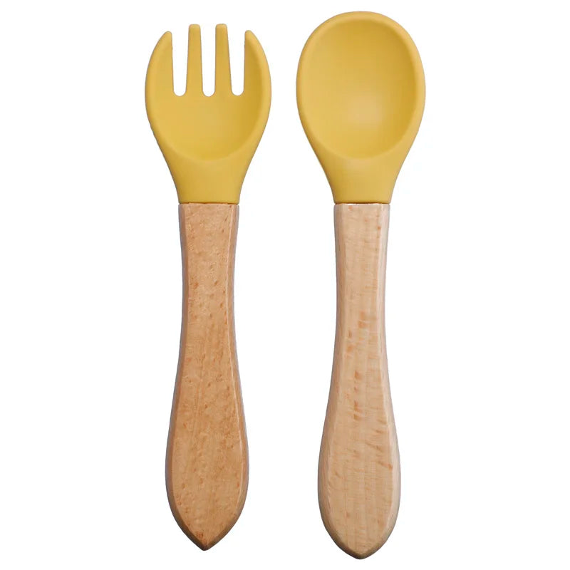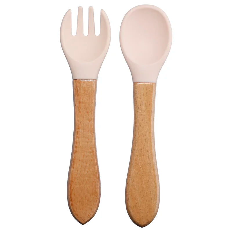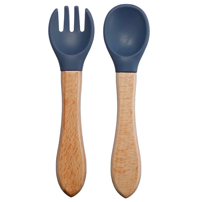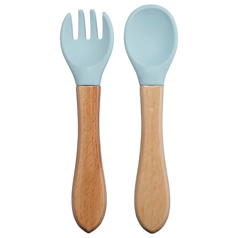 Baby Silicone Feeding Fork & Spoon Set with Wooden Handle - Perfect Gift for Christmas or Birthday