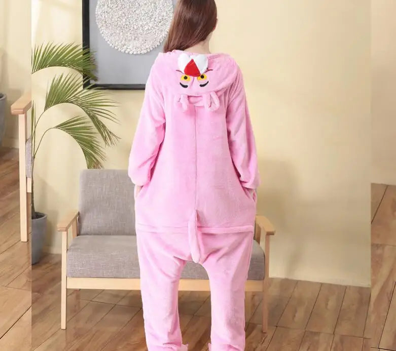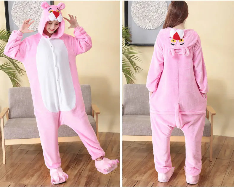 Adult Pink Panther Onesie Pajamas Costume, Flannel Cartoon Jumpsuit for Halloween Party