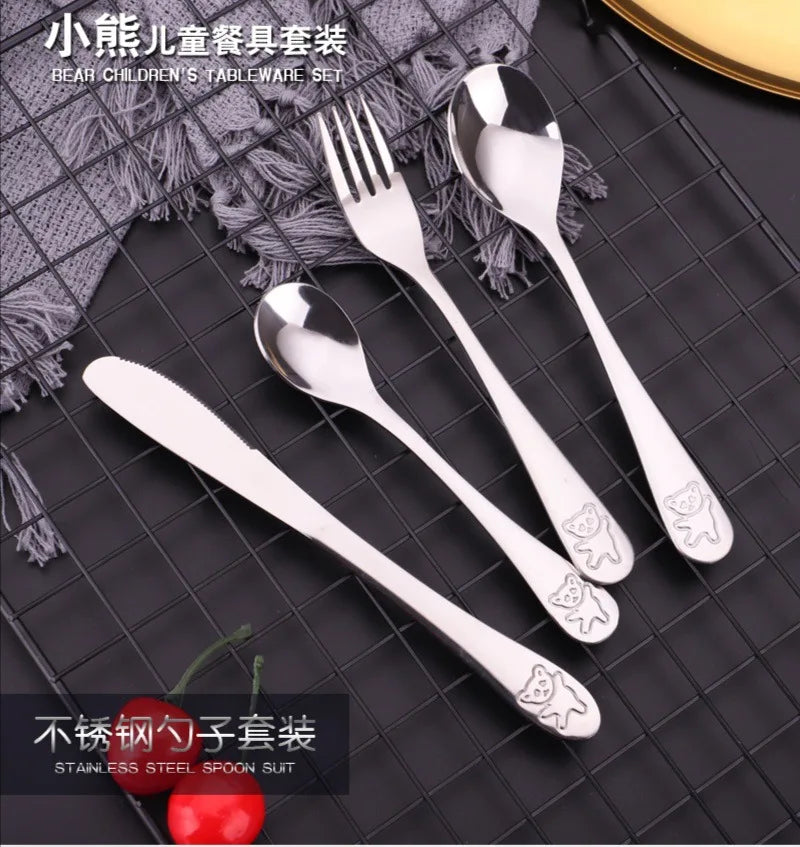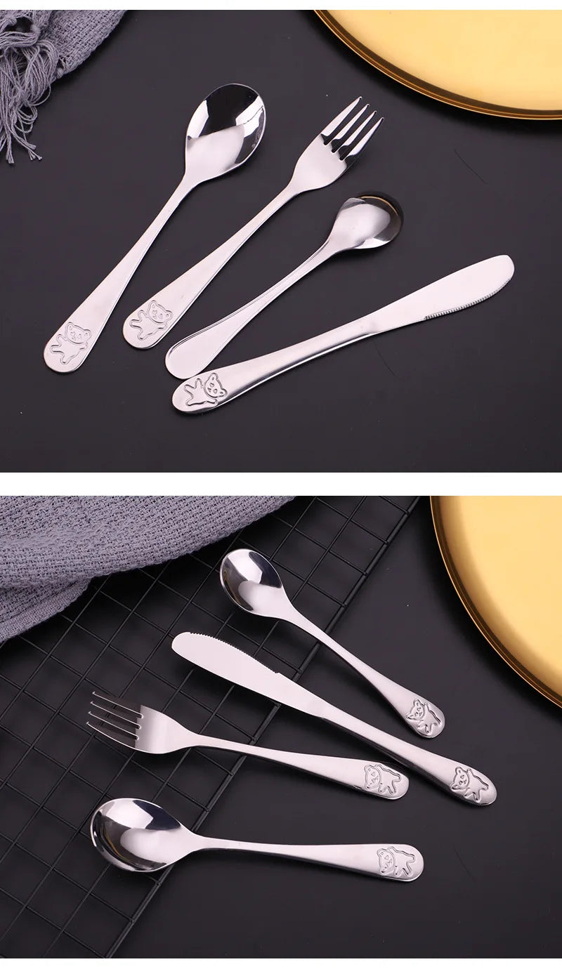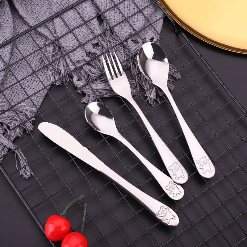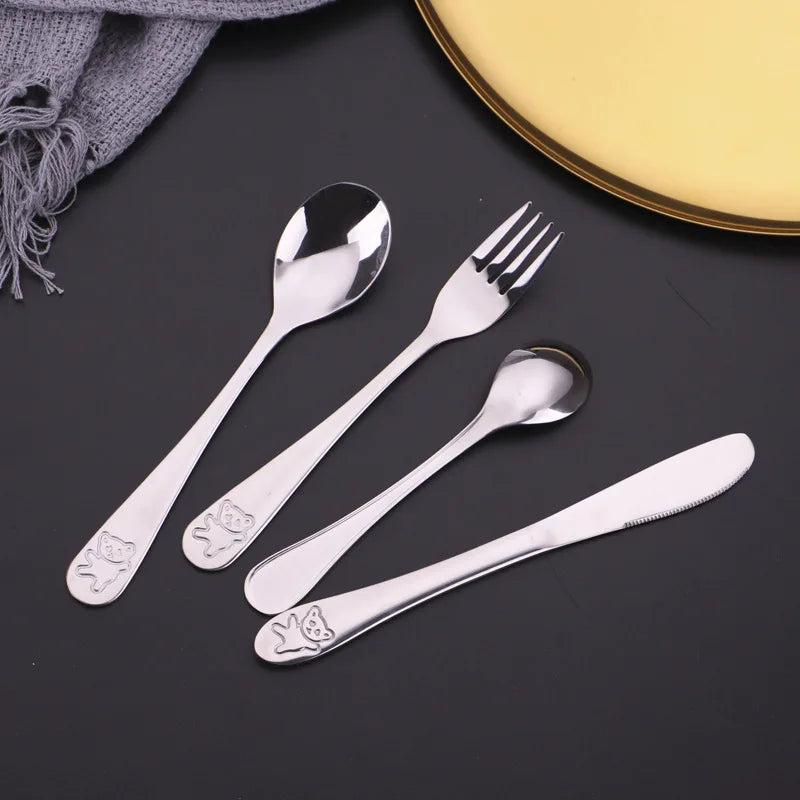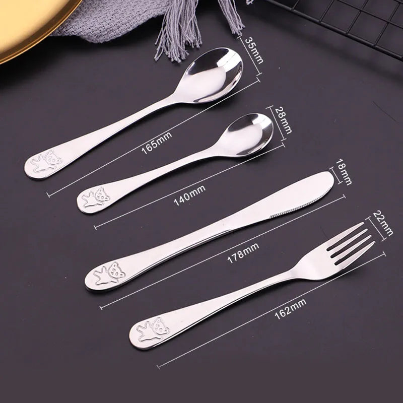 The set includes a teaspoon, spoon, fork, and knife, all styled in a sleek silver finish. Their multifunctional design makes them ideal for both home and outdoor dining, ensuring your child can enjoy their meals anytime, anywhere.