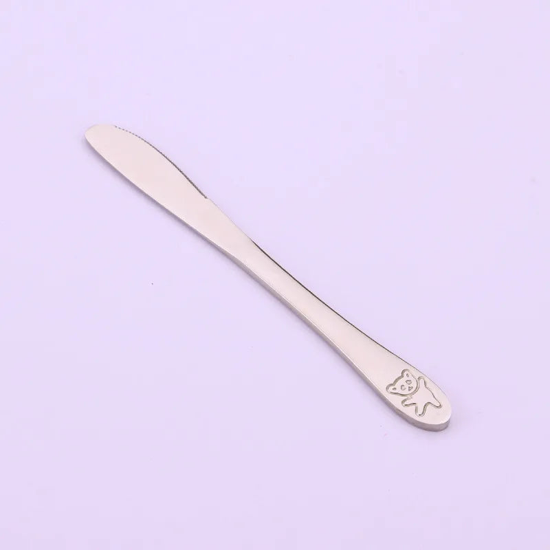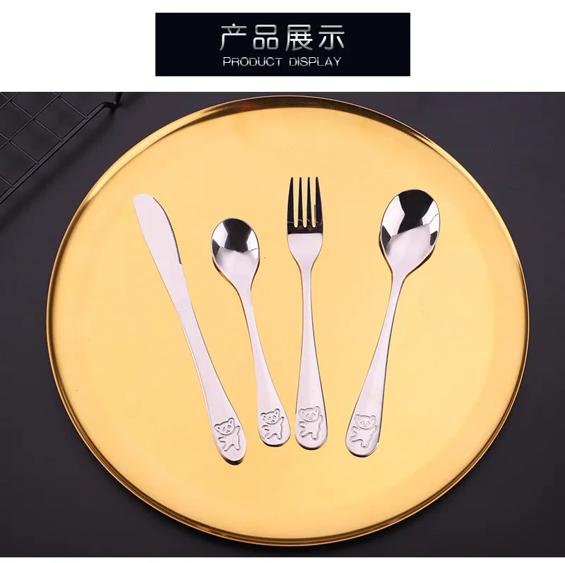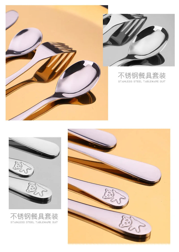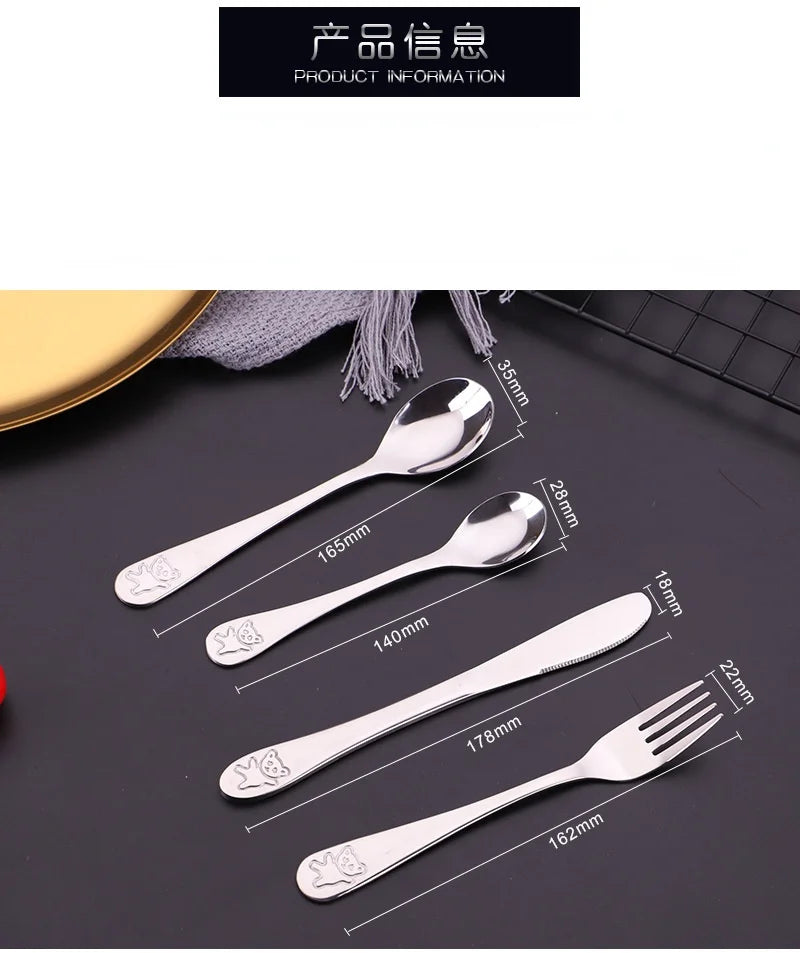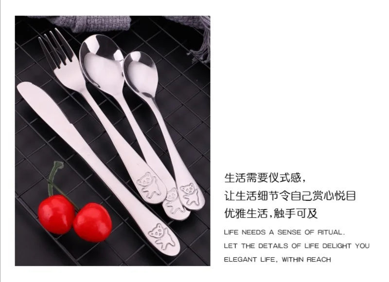 The set includes a teaspoon, spoon, fork, and knife, all styled in a sleek silver finish. Their multifunctional design makes them ideal for both home and outdoor dining, ensuring your child can enjoy their meals anytime, anywhere.