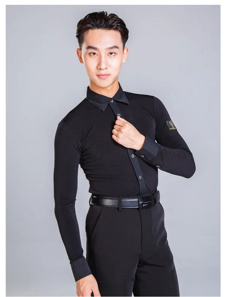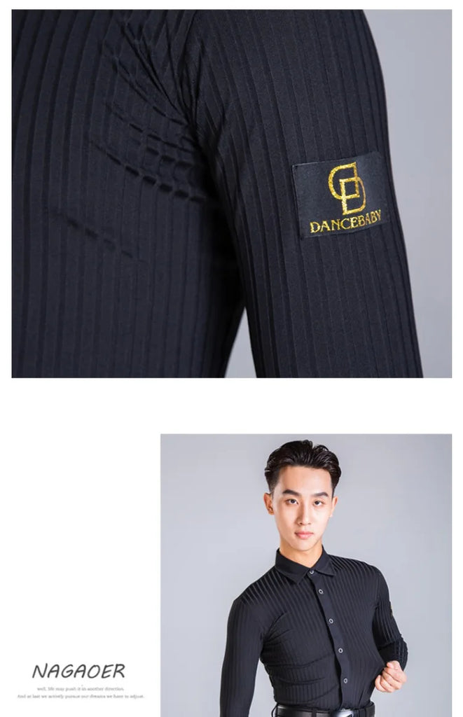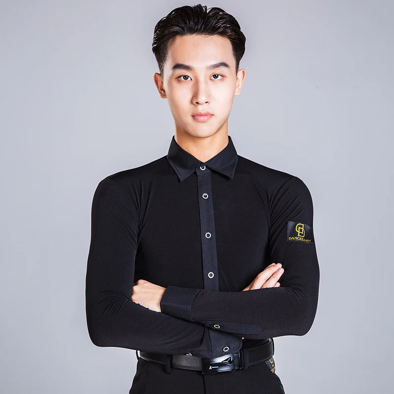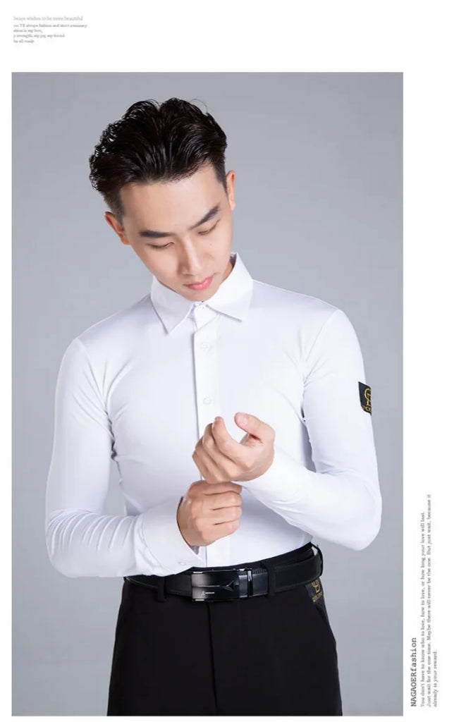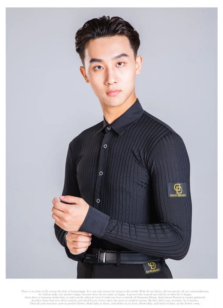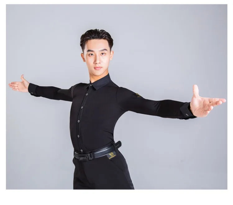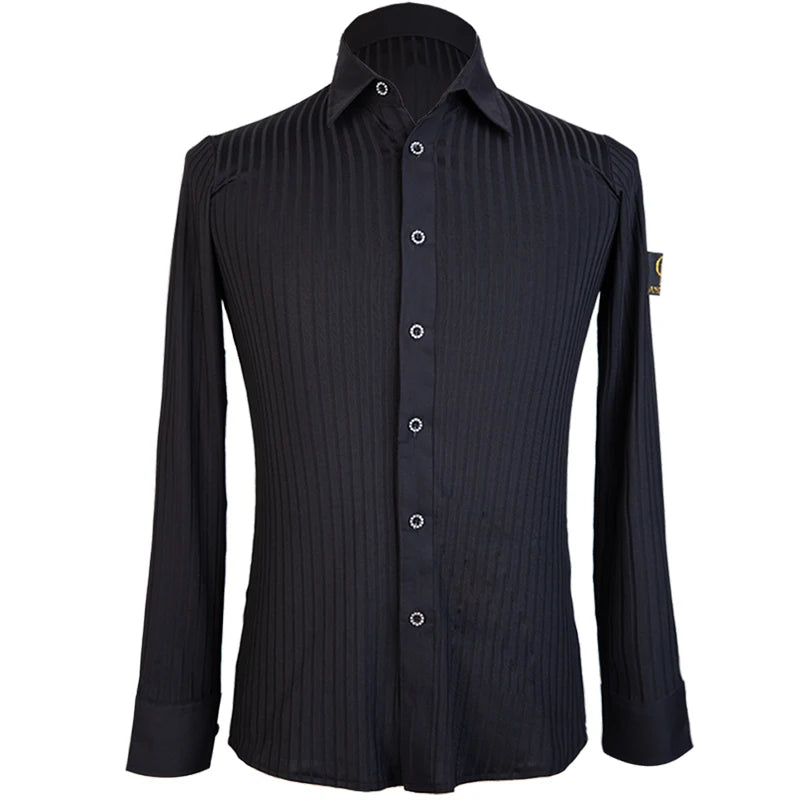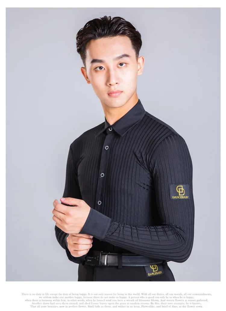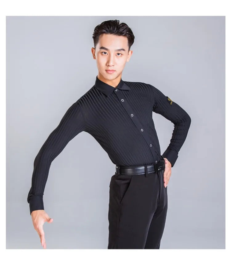 Elevate your dance performance with this sleek and stylish men's Latin dance shirt. Crafted from a high-quality blend of polyester and spandex, this shirt provides both comfort and flexibility, ensuring ease of movement on the dance floor. The long-sleeve design, made with crystal hemp fabric, adds a touch of elegance, making it perfect for performances or practice sessions. Available in sizes M, L, XL, and XXL, this shirt is designed to fit the modern dancer who values both style and functionality.