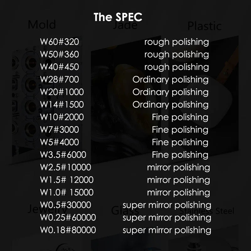 With options from W0.18, the finest, to W60, the coarsest, you can seamlessly transition from grinding to polishing, ensuring a flawless mirror finish. Adapt your approach based on the surface's roughness to achieve the perfect sheen.