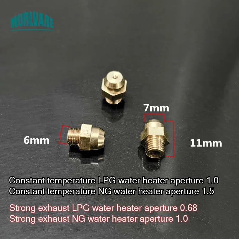 Its precision-engineered apertures of 0.68, 1.0, and 1.5 ensure optimal performance, with specific configurations available for LPG and NG water heaters, providing strong exhaust and constant temperature functionalities. The nozzle is easy to install with an external thread connection (M6 thread type) and supports customized services for tailored solutions. Replacement is straightforward, requiring only a sealant for a secure and leak-free operation.