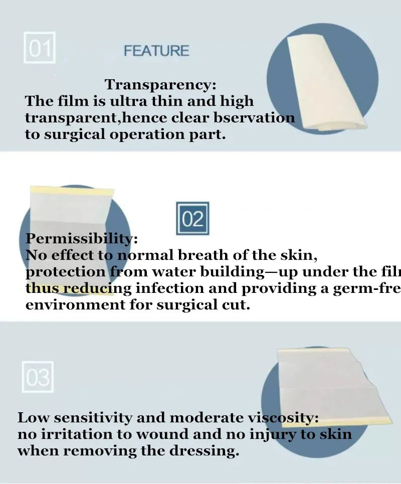 The film is designed to resist water and germs, ensuring a clean operational environment. Its high elasticity allows it to conform seamlessly to body contours for reliable adhesion without irritating the skin. With low sensitivity and moderate viscosity, it ensures easy removal without causing injury.