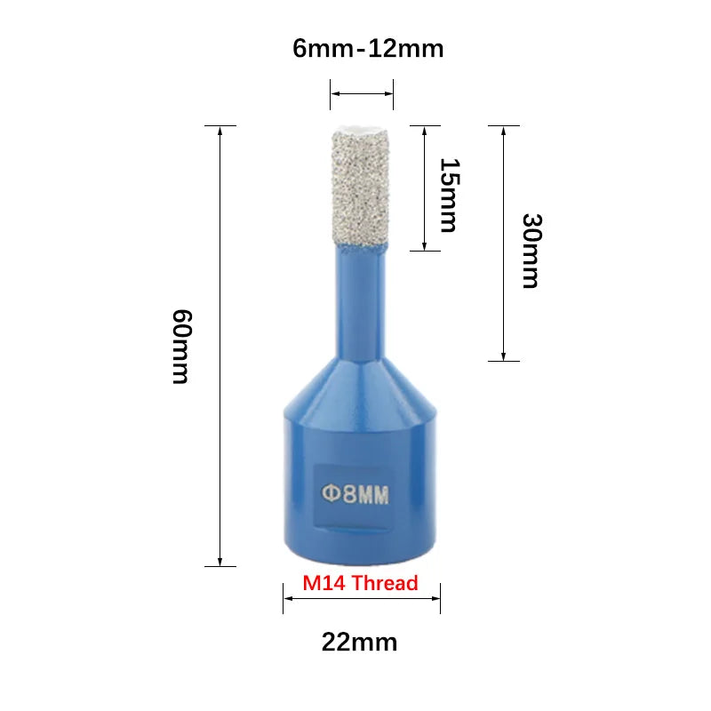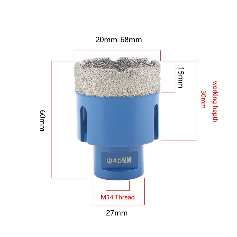 Introducing our versatile M14 Thread Brazed Diamond Dry Drilling Bit, designed for precision and durability. Ideal for creating smooth and clean holes in ceramic tile, granite, marble, and masonry surfaces. With a wide range of diameters from 6mm to 68mm, this tool ensures efficient drilling without the need for water.