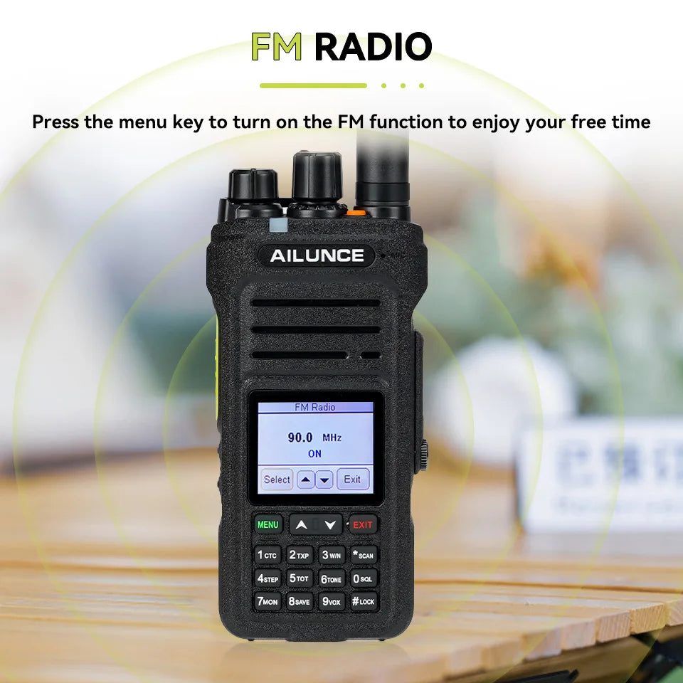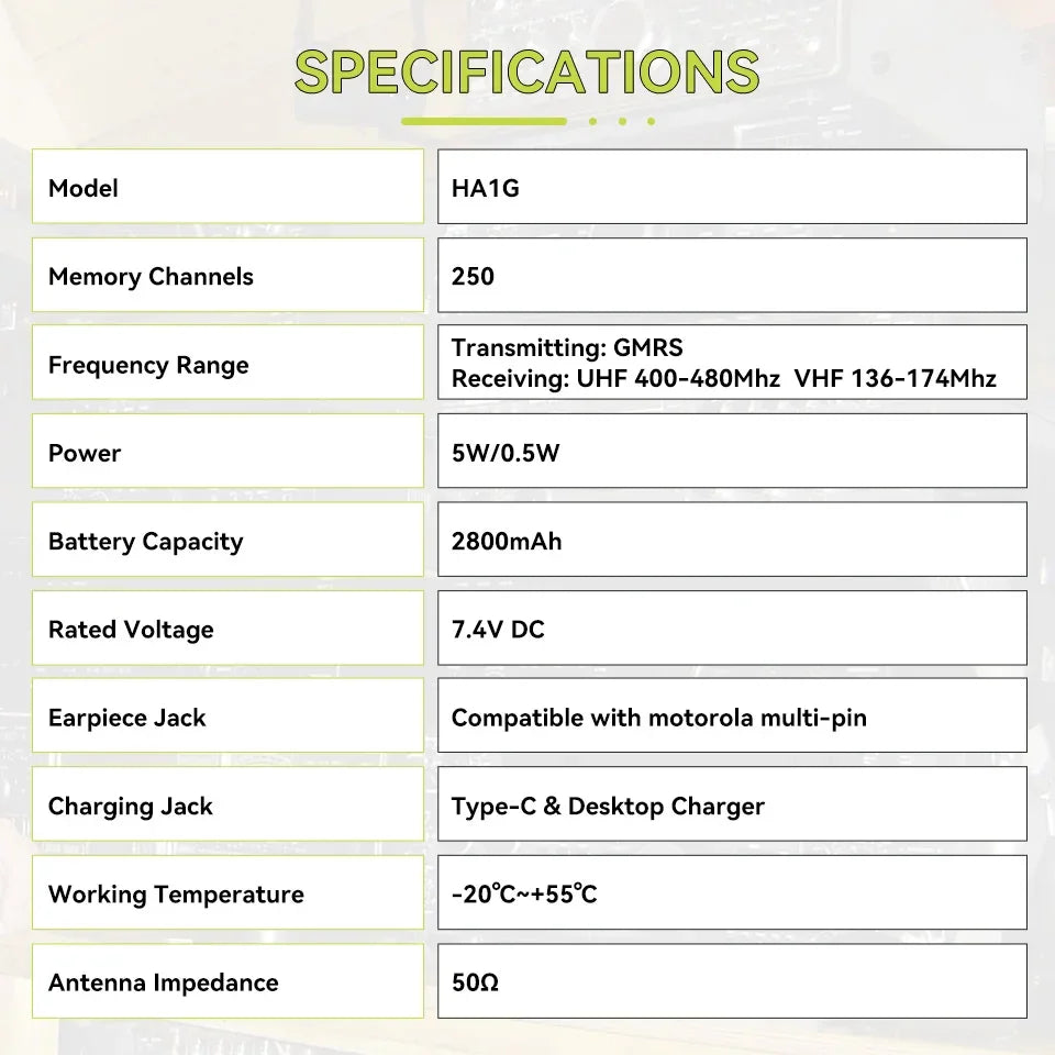 - Extra Features: Dual-band reception, second programmable PTT, FM radio, VFO mode, busy channel lockout, low battery alert, key lock function, CTCSS/DCS codes.