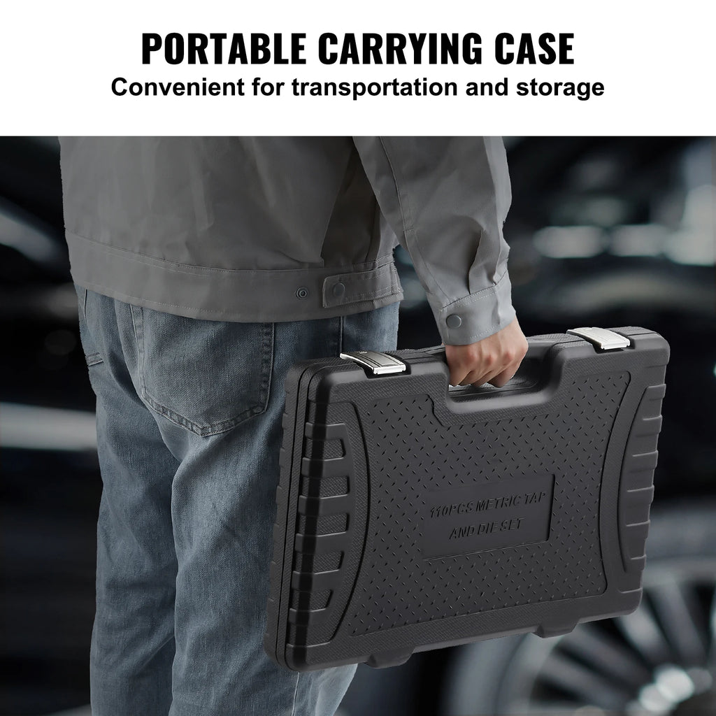 Elevate your threading tasks with our comprehensive 110-piece Tap and Die Set, expertly crafted from high-strength bearing steel for unmatched durability. Designed for precision and performance, this set undergoes advanced CNC machining and double polishing, ensuring smooth and accurate threading every time. Housed in a compact, portable case with protective cushioning, your tools remain organized and secure, ready for any job from home maintenance to automotive repairs.
