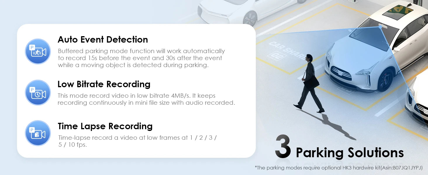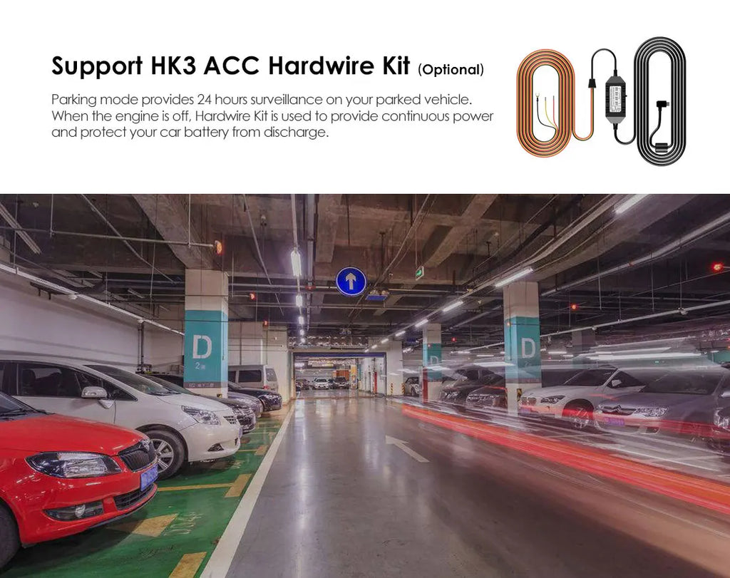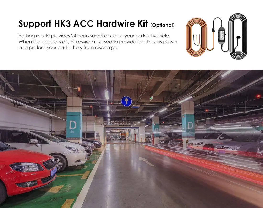 Designed with advanced parking mode capabilities, choose from Auto Event Detection, Time Lapse, or Low Bitrate Recording to keep your vehicle monitored. The buffered parking mode records events before and after they occur, with an optional HK3 ACC hardwire cable providing continuous power without draining your car battery.