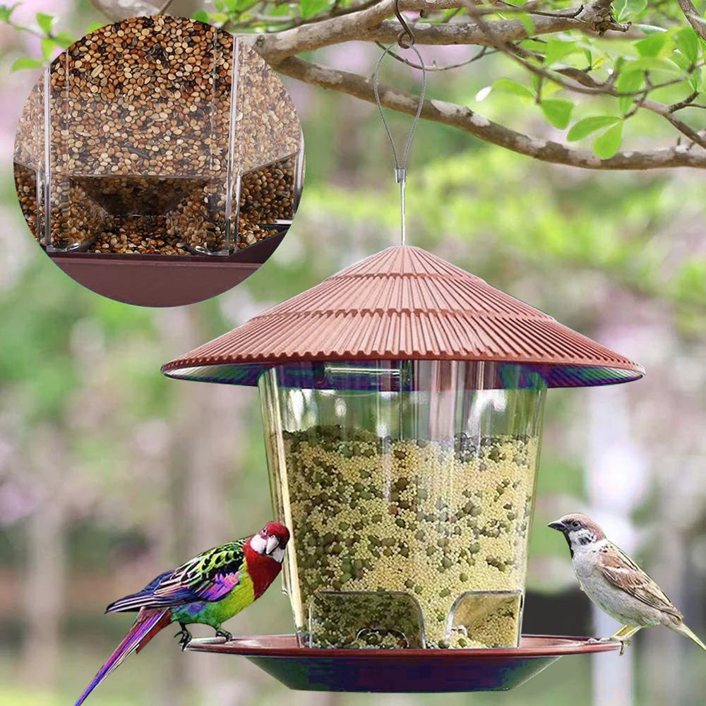 Designed in a unique hexagonal shape with a sloping roof, it offers birds shelter from harsh weather, inviting visits from charming species such as cardinals and bluebirds. The innovative refill system ensures a continuous supply of seeds to keep your feathered friends coming back.