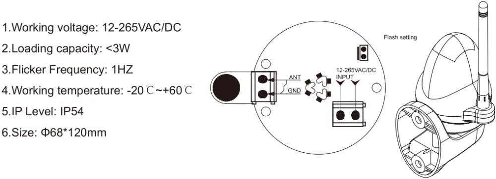This flashing lamp is engineered to operate over a wide voltage range from 12VDC/AC to 265VAC, accommodating various power sources. It features a silent operation with only flashing lights, ensuring effective alert signaling without sound. Ideal for enhancing security systems, this lamp offers peace of mind and improved safety.