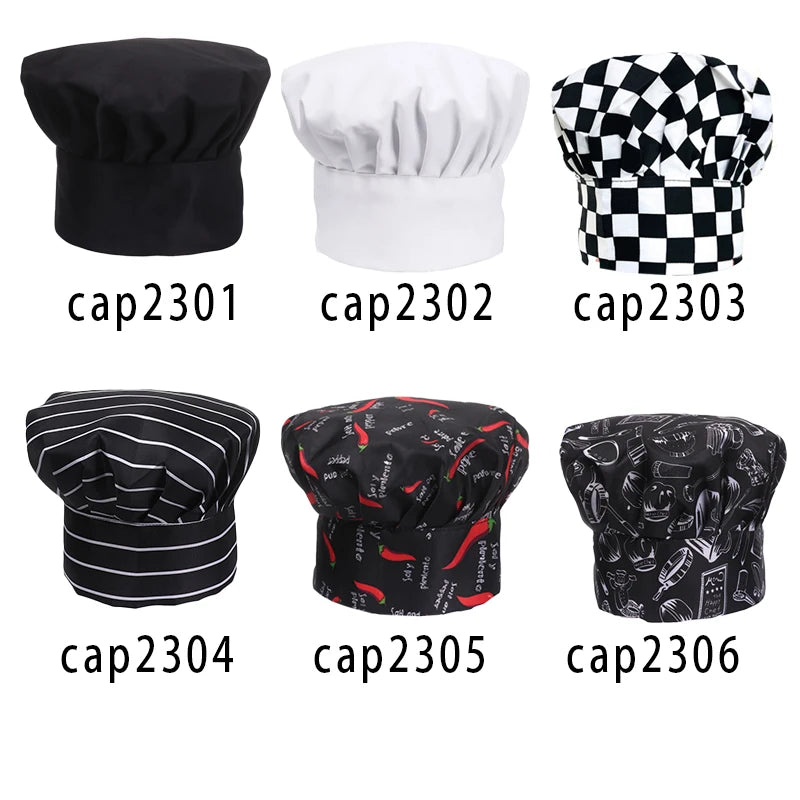 Elevate your kitchen attire with this versatile chef cap, ideal for chefs, waitstaff, and sushi restaurant personnel. Designed for both men and women, this stylish mushroom cap comes in a range of colors including black, white, and checkered patterns to complement your restaurant's theme or chef jacket.