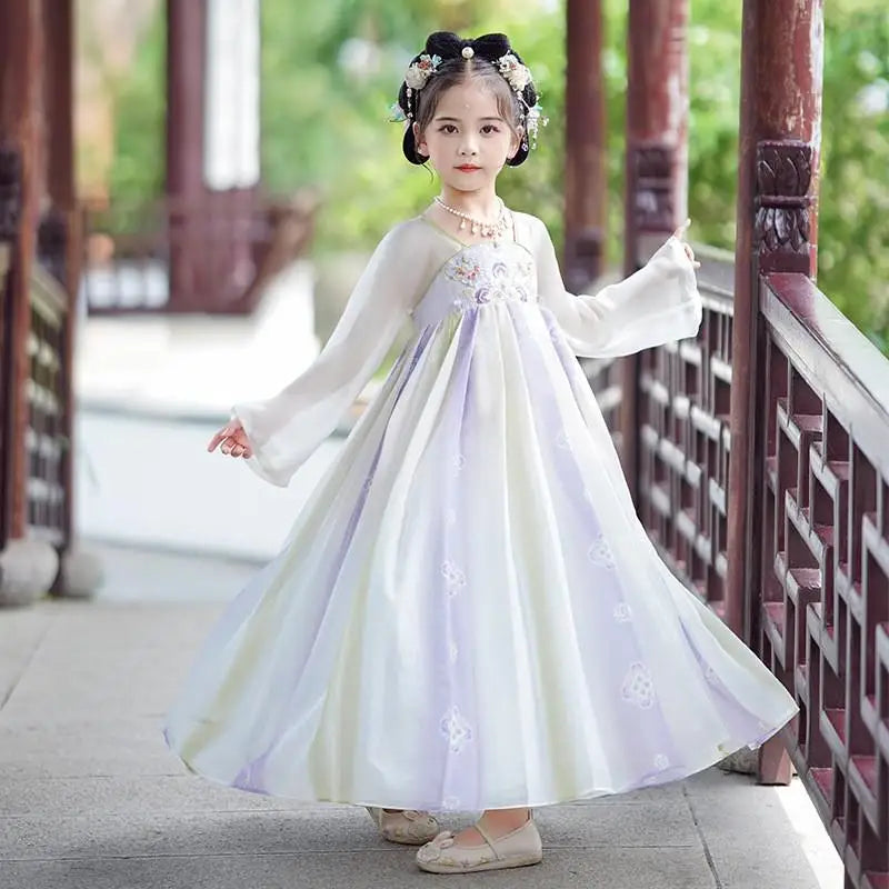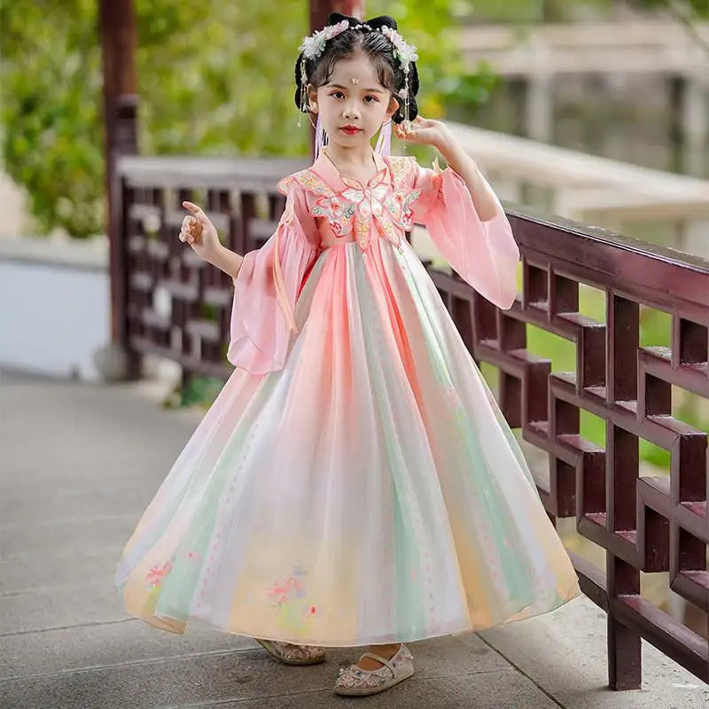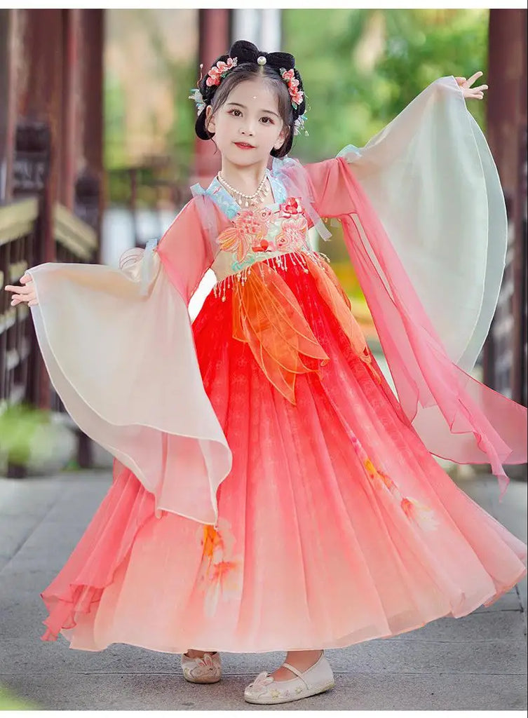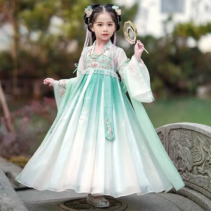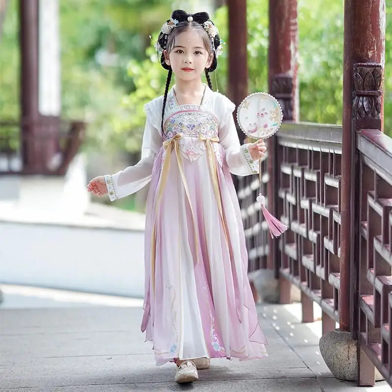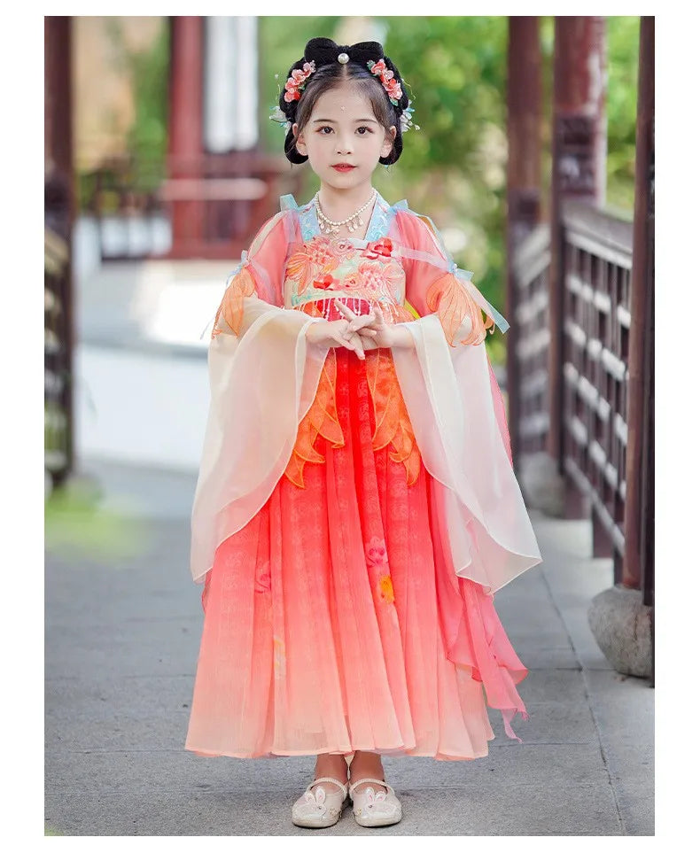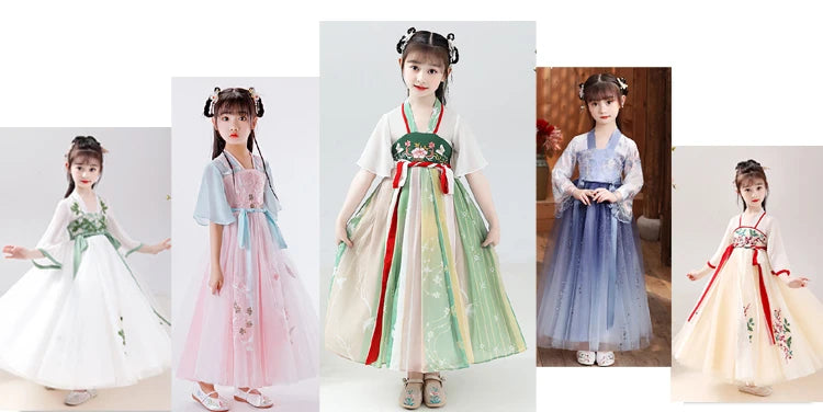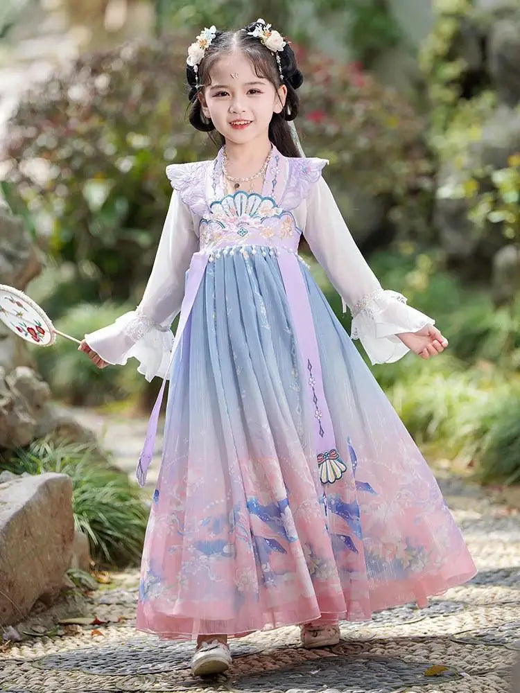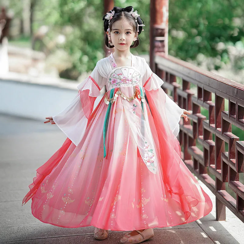 Transform your little girl's wardrobe with this enchanting Chinese Tang Suit Cheongsam Hanfu. Designed for children, this outfit captures the essence of tradition and elegance, making it perfect for evening events, parties, or performances. Constructed from high-quality polyester, it offers a soft and sagging chiffon feel, delicately enhanced with embroidery.