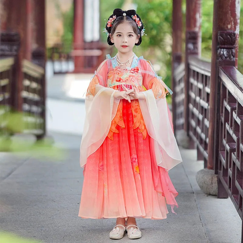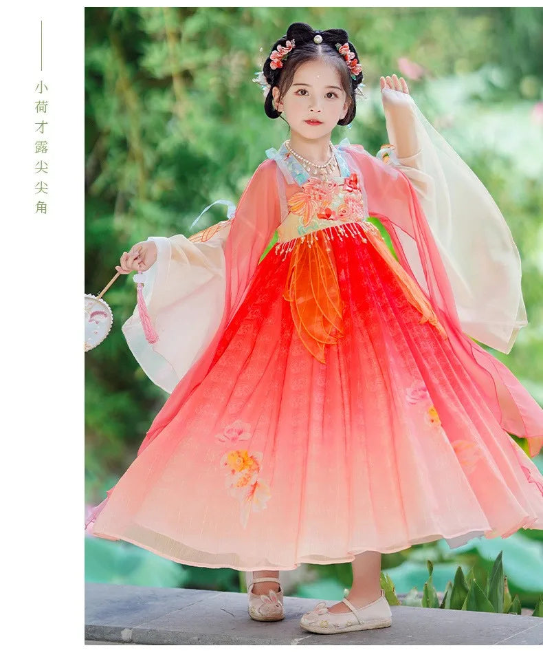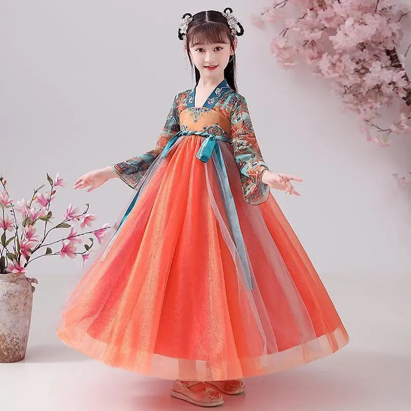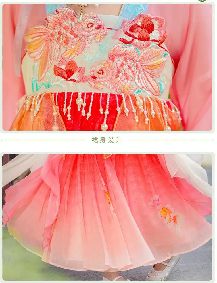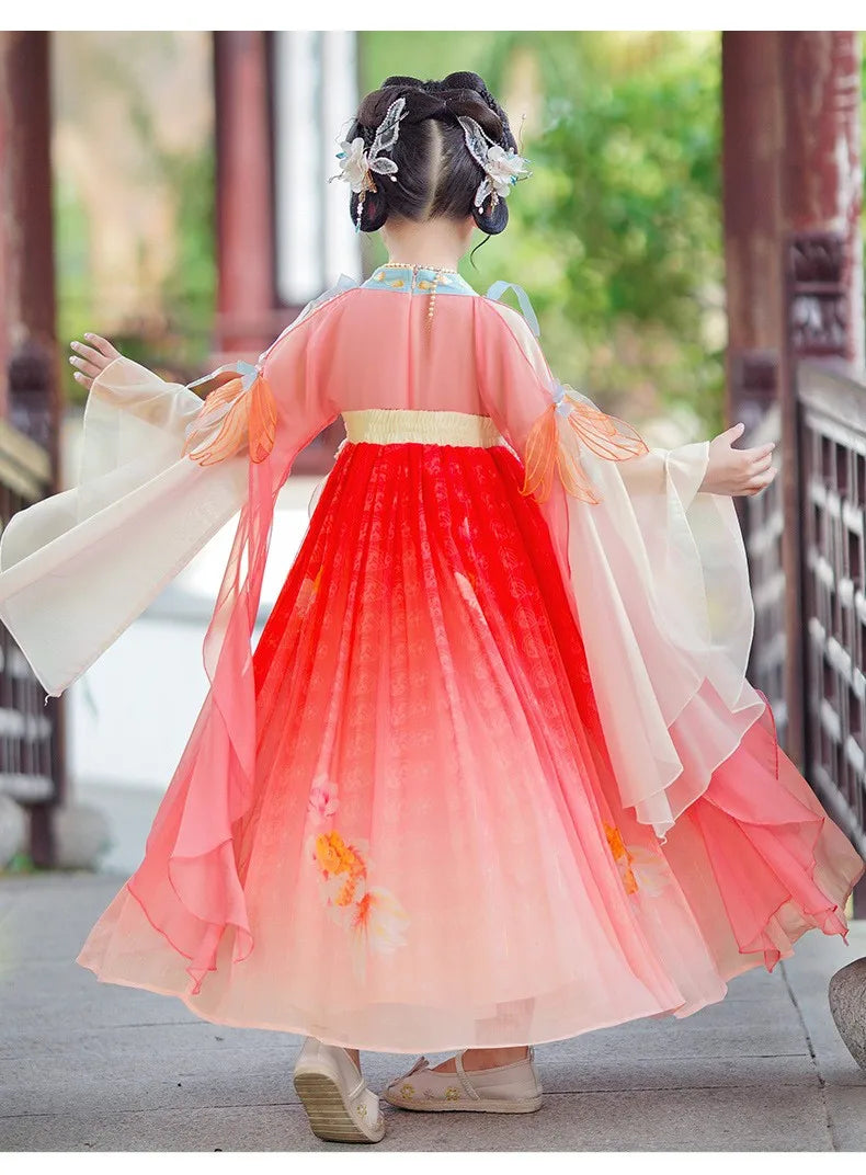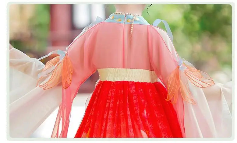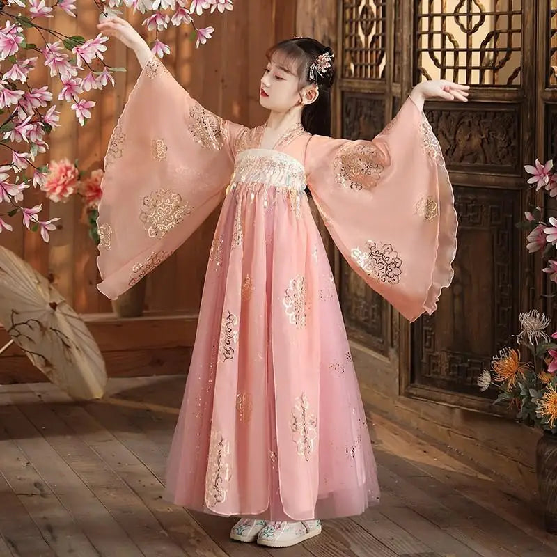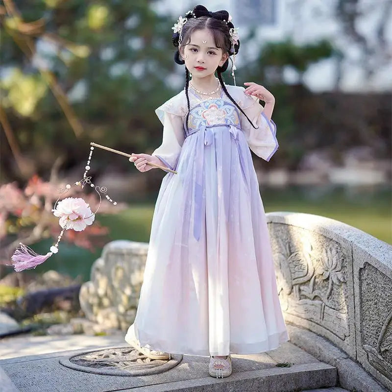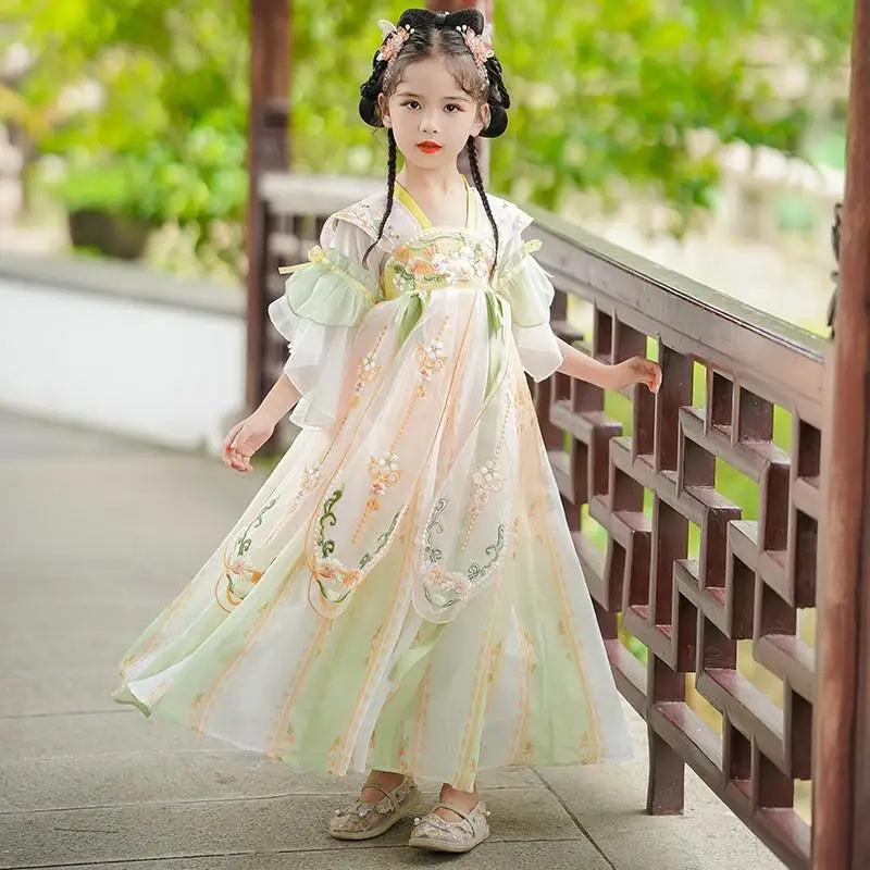 Transform your little girl's wardrobe with this enchanting Chinese Tang Suit Cheongsam Hanfu. Designed for children, this outfit captures the essence of tradition and elegance, making it perfect for evening events, parties, or performances. Constructed from high-quality polyester, it offers a soft and sagging chiffon feel, delicately enhanced with embroidery.