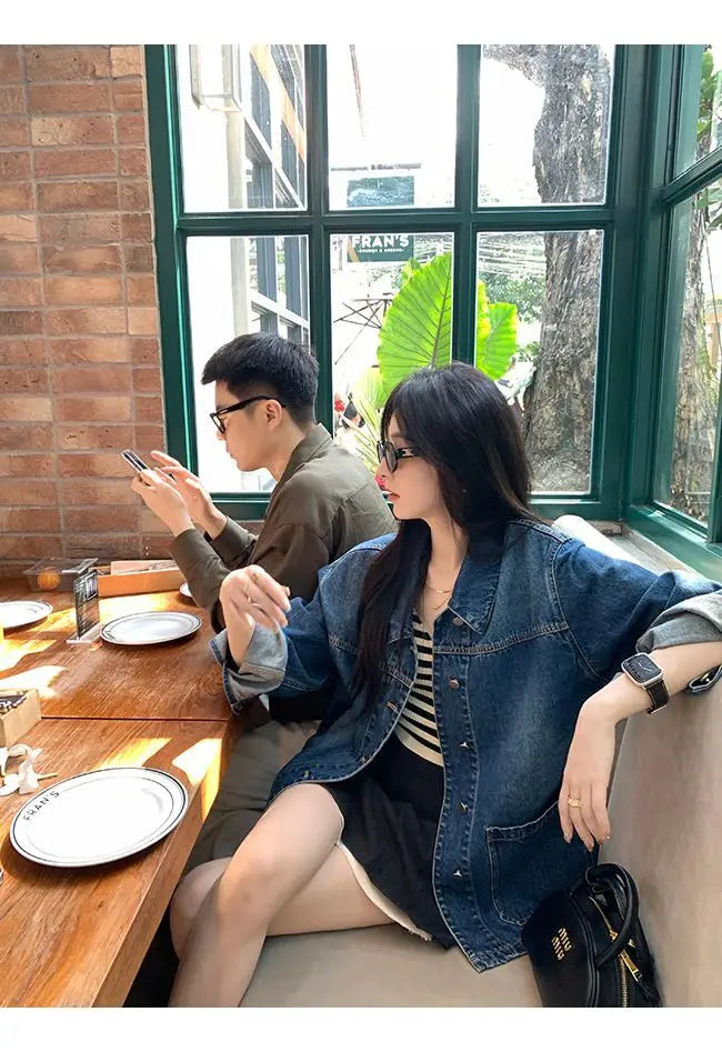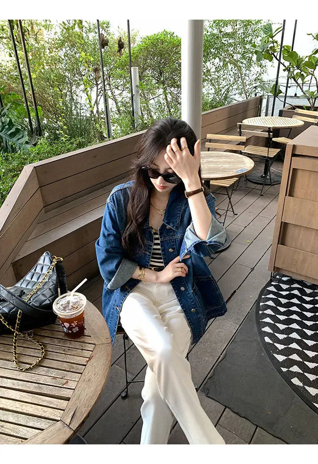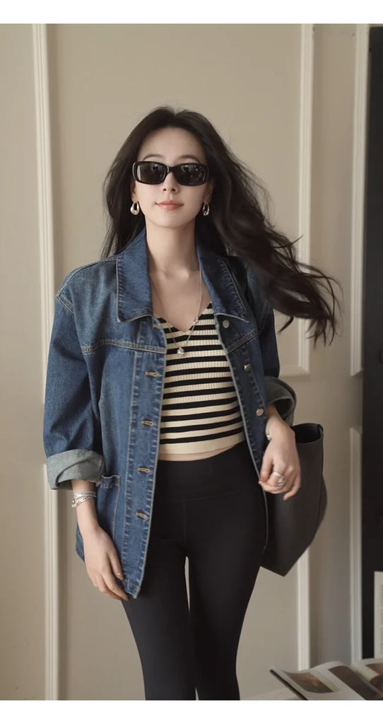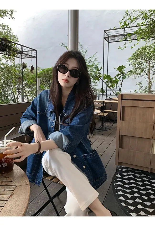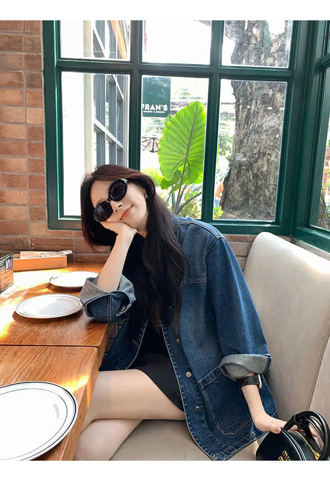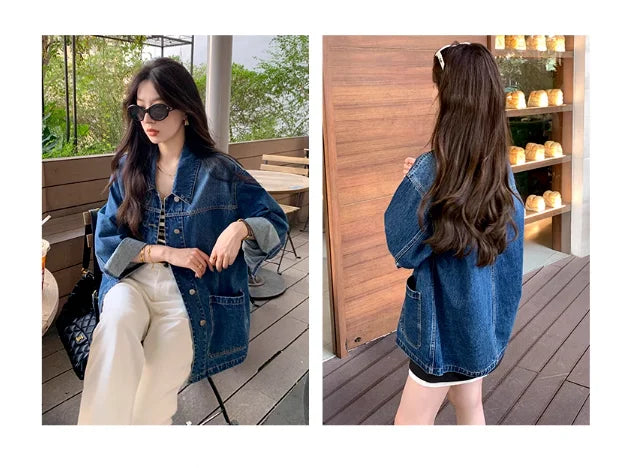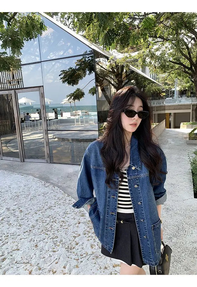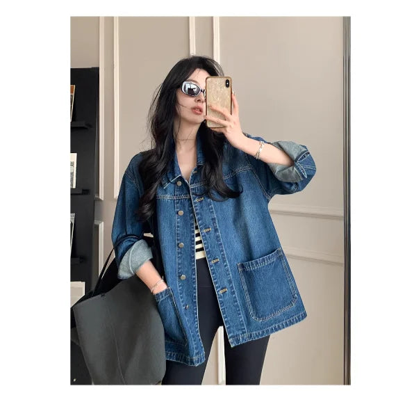 Casual Loose Denim Jacket with Pockets, Retro Turn-Down Collar, Long Sleeve, Chic All-Match Coat