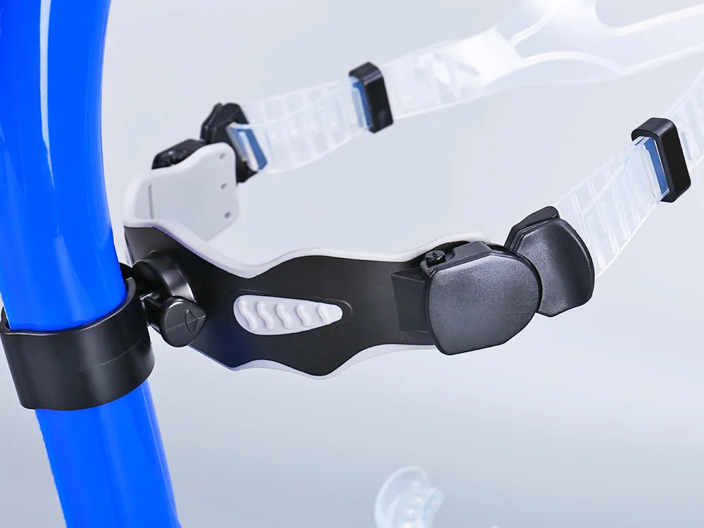 Adaptable to various swimming styles including freestyle, backstroke, butterfly, and breaststroke, the snorkel features an adjustable bracket and protective head pad for versatility.